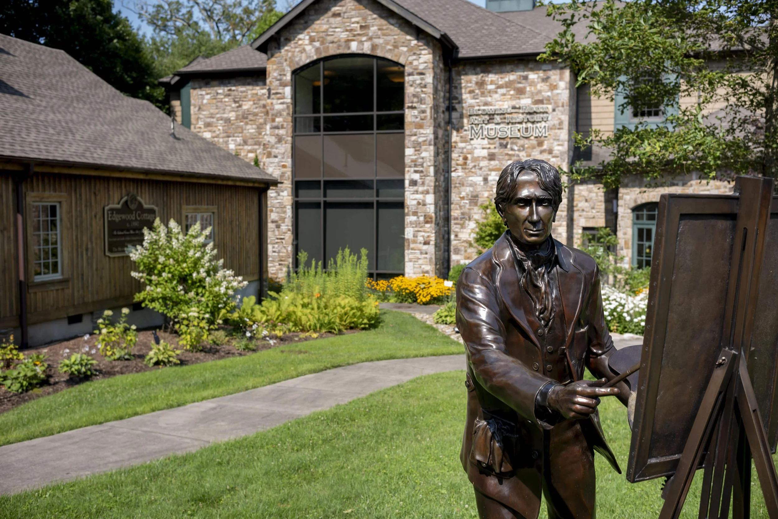 Bronze statue of a painter with a canvas and brush, in front of a stone museum building and garden, with a sign reading 'Edgewood Cottage.'