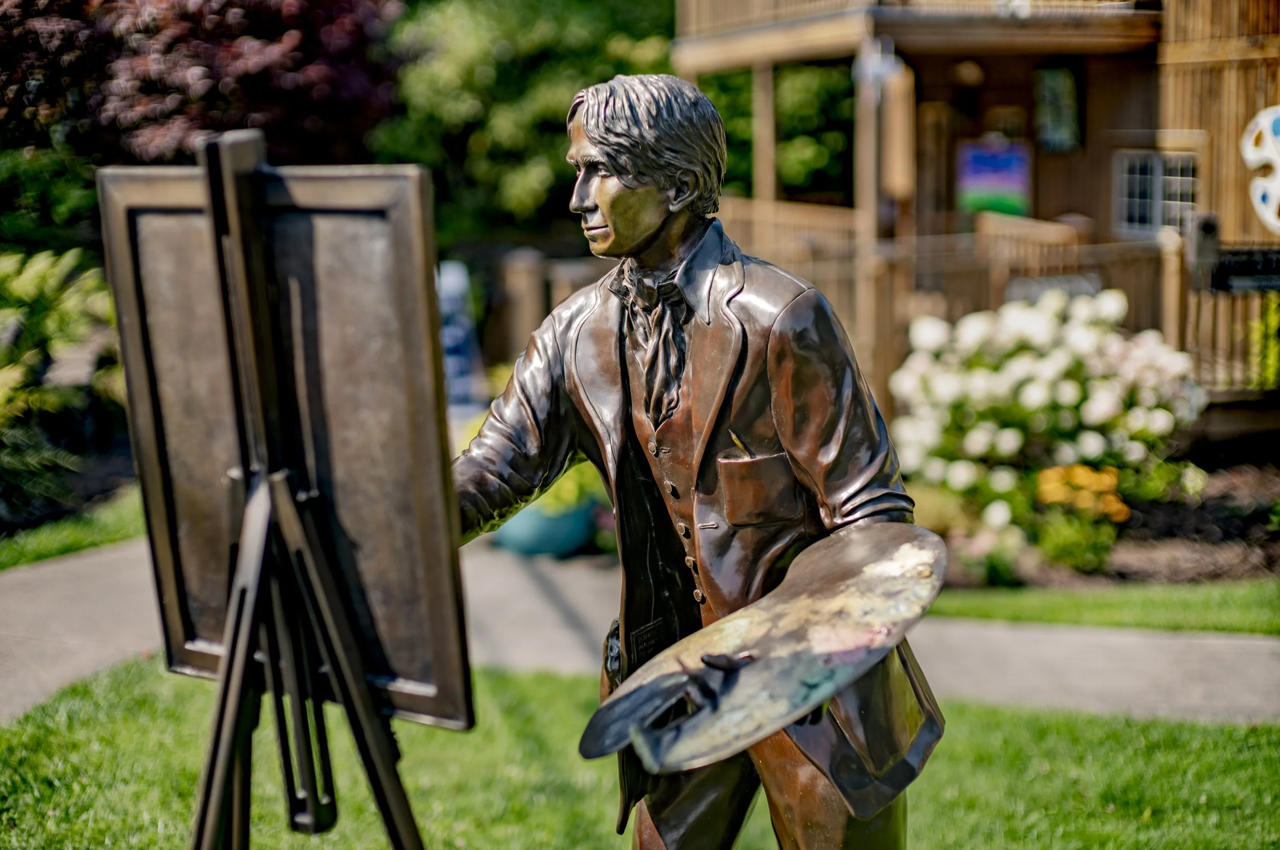 Bronze sculpture of a painter at an easel in front of a rustic wooden building called Edgewood Cottage, surrounded by lush greenery and flowers. A sign on the lawn reads 'Open Today.' View fullsize