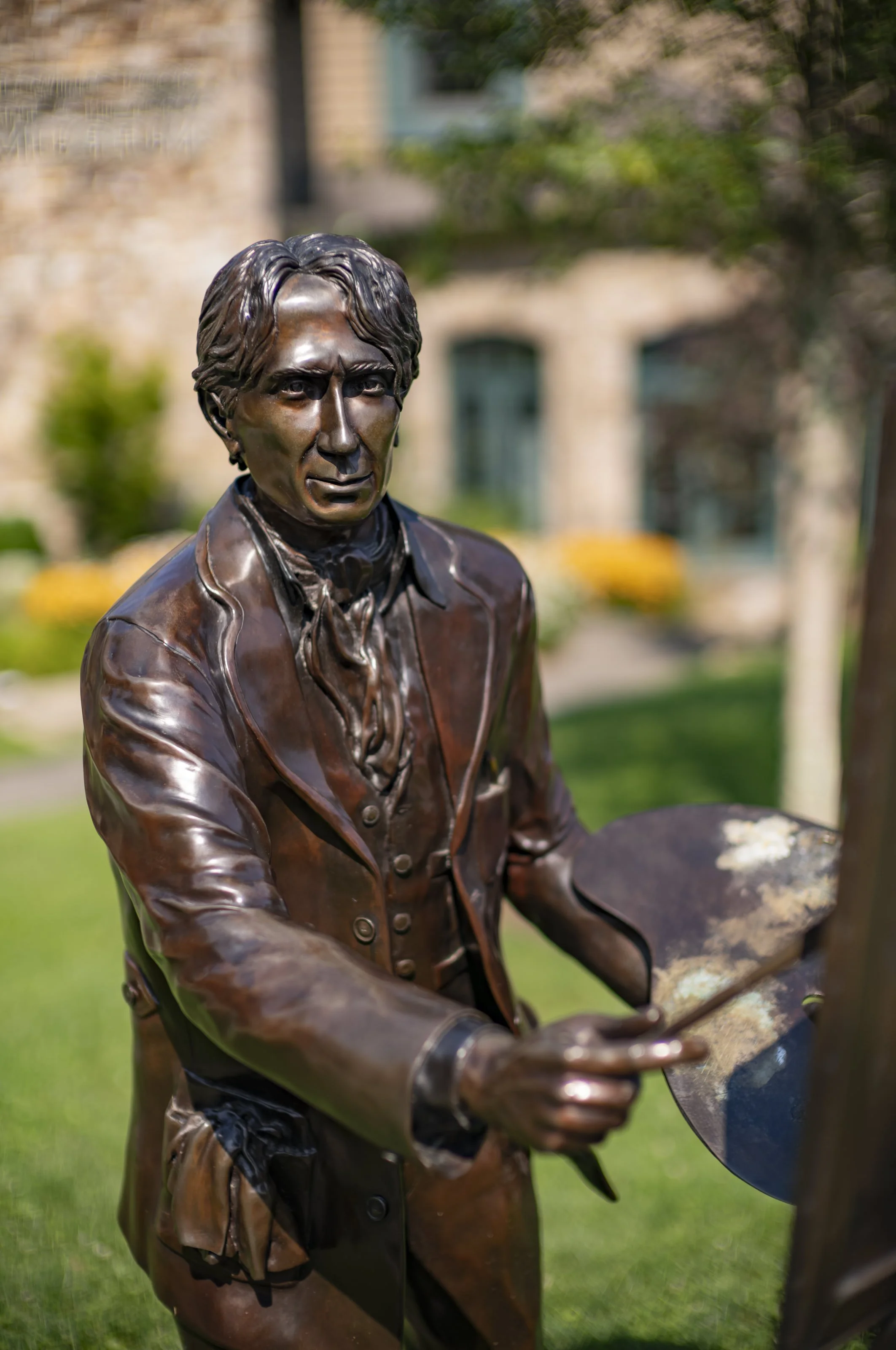 Bronze statue of a painter with a canvas and brush, in front of a stone museum building and garden, with a sign reading 'Edgewood Cottage.' View fullsize