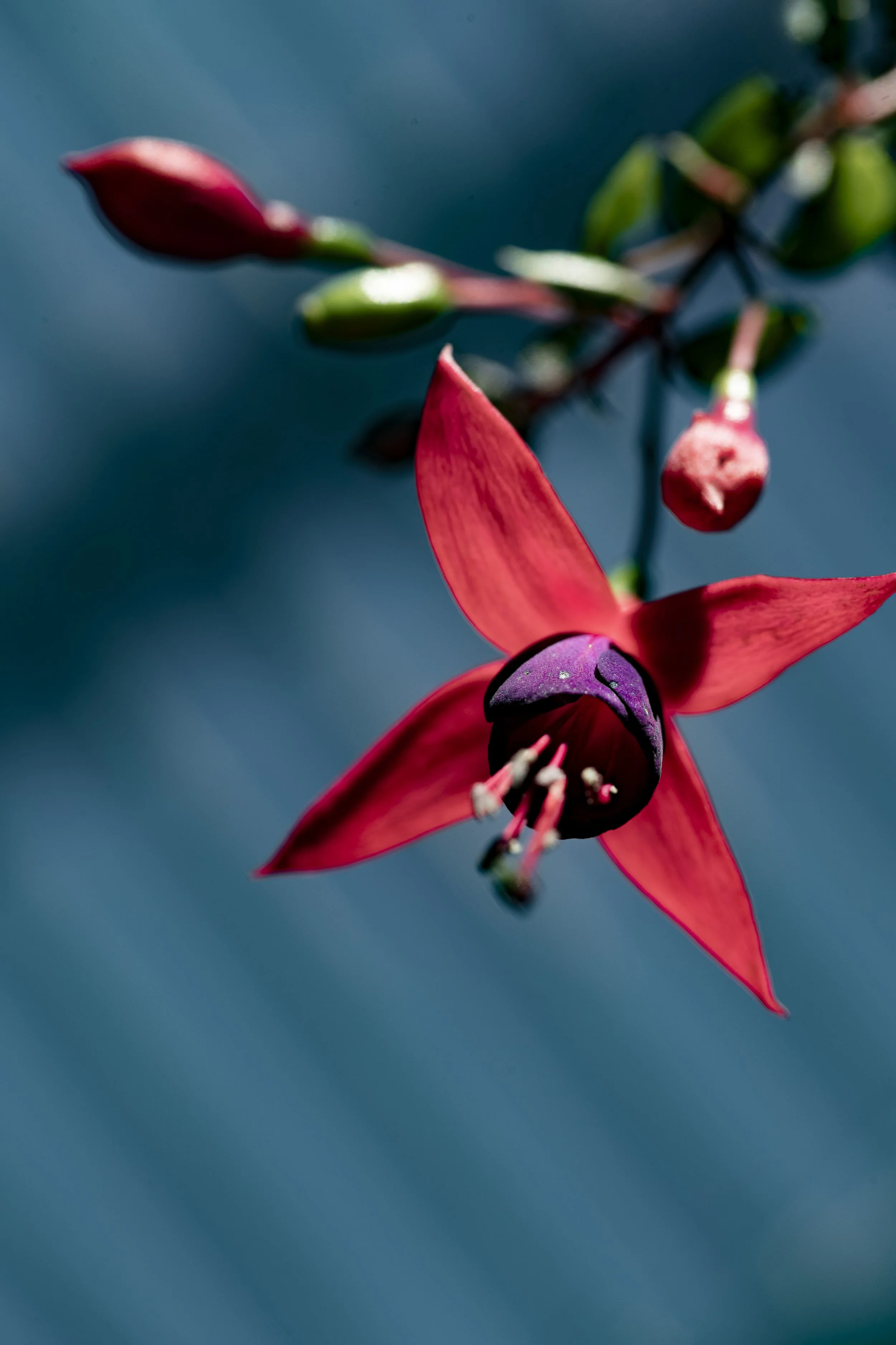 Close-up of a red and purple fuchsia flower with buds on a blurred background.