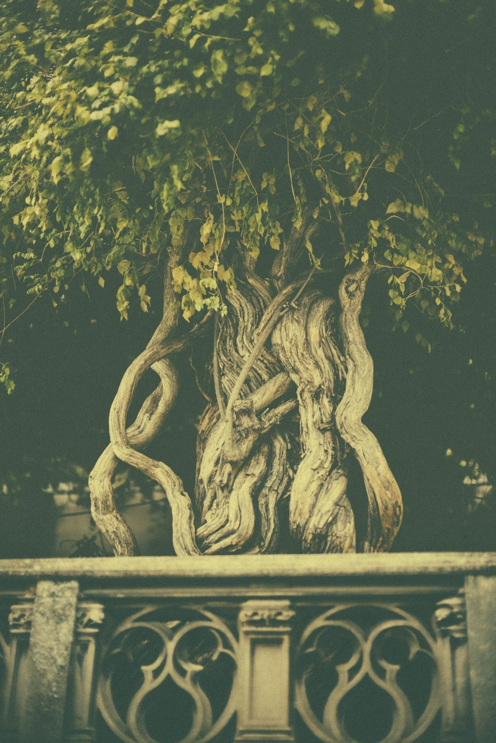 Twisted tree with green leaves behind an ornate stone railing. View fullsize