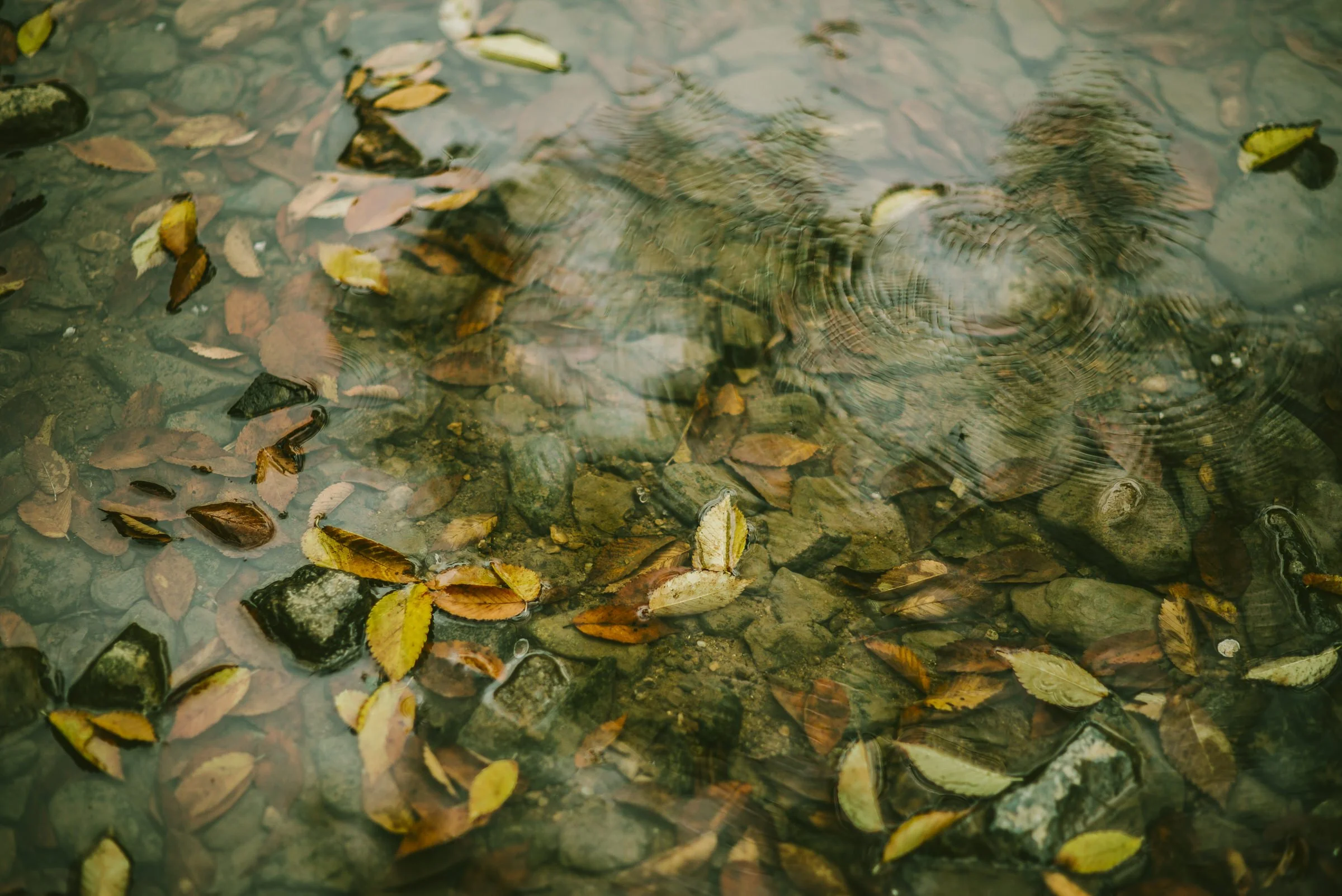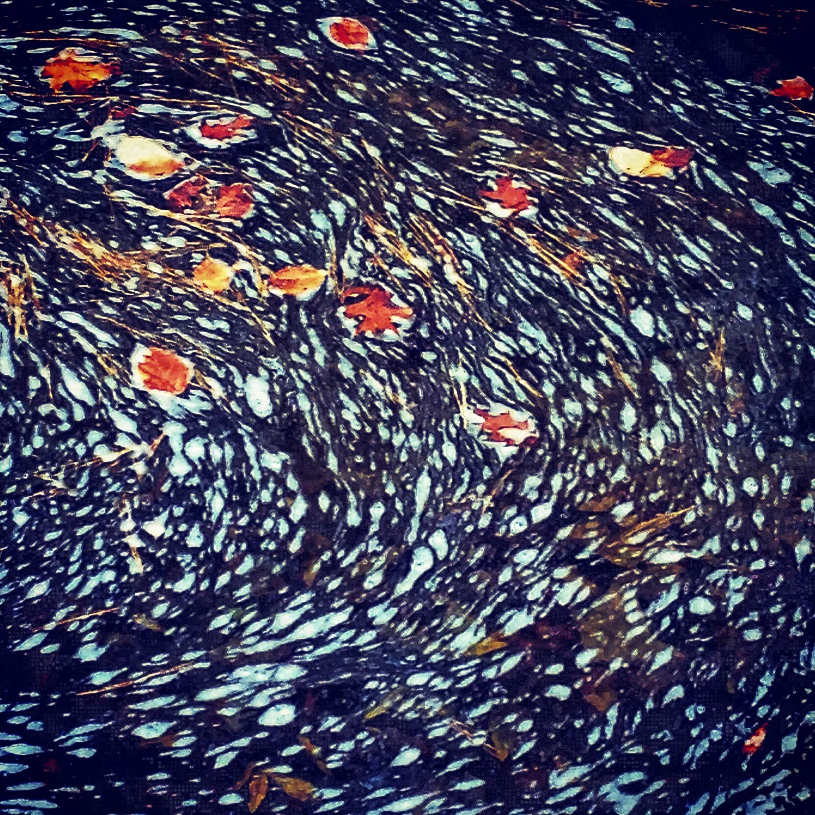 Swirling water with floating autumn leaves