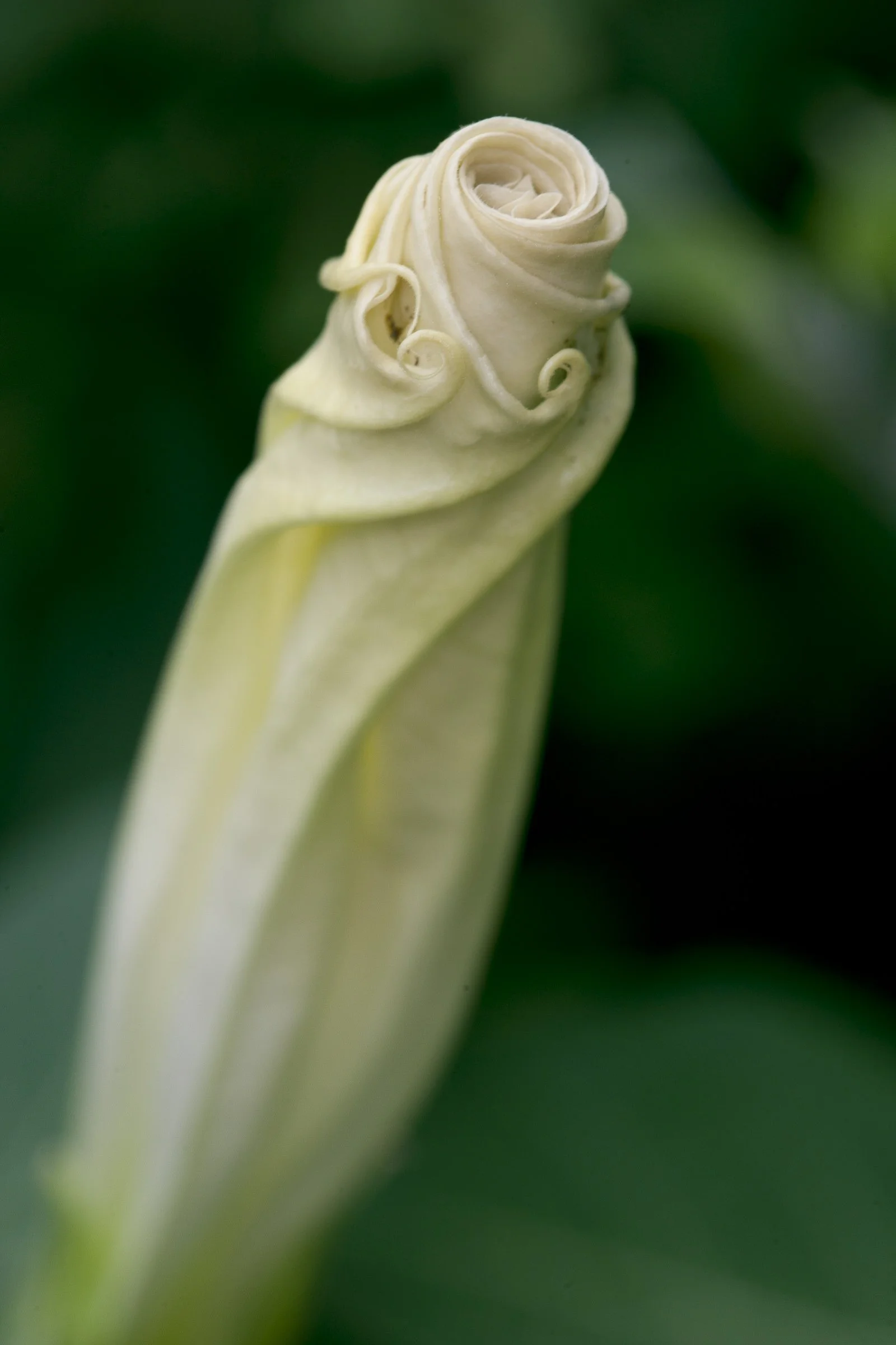 Close-up of a partially closed, spiral-shaped white flower bud against a blurred green background. View fullsize