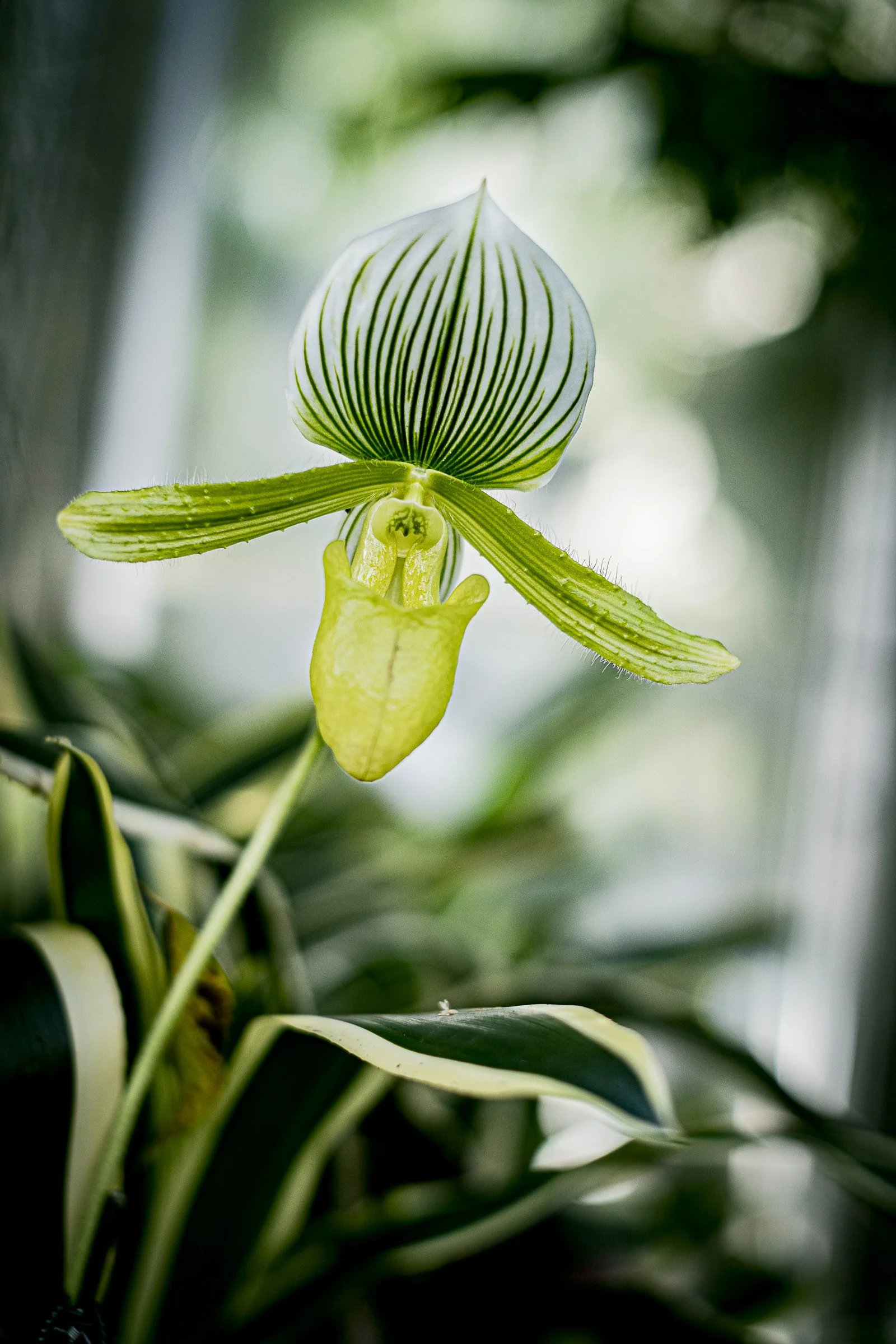 Close-up of a green and white Paphiopedilum orchid in bloom with blurred leaves in the background.
