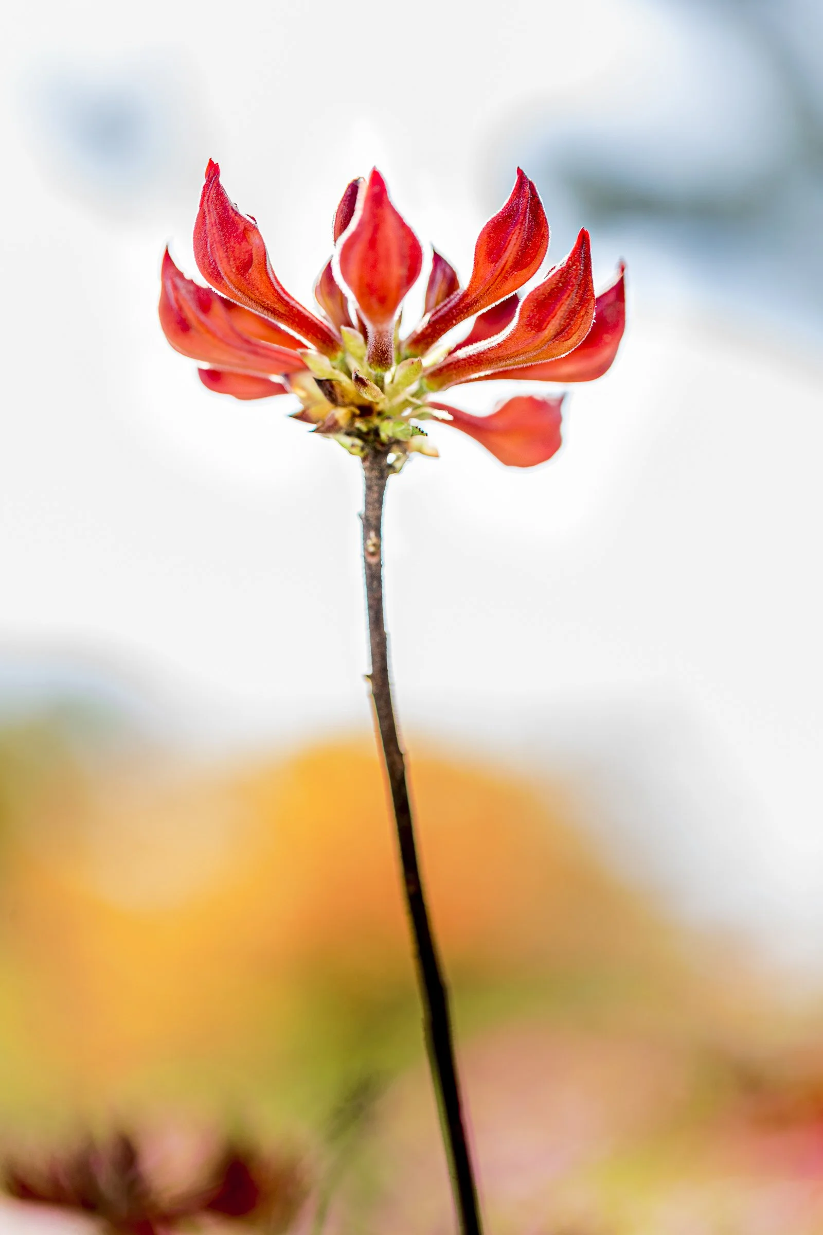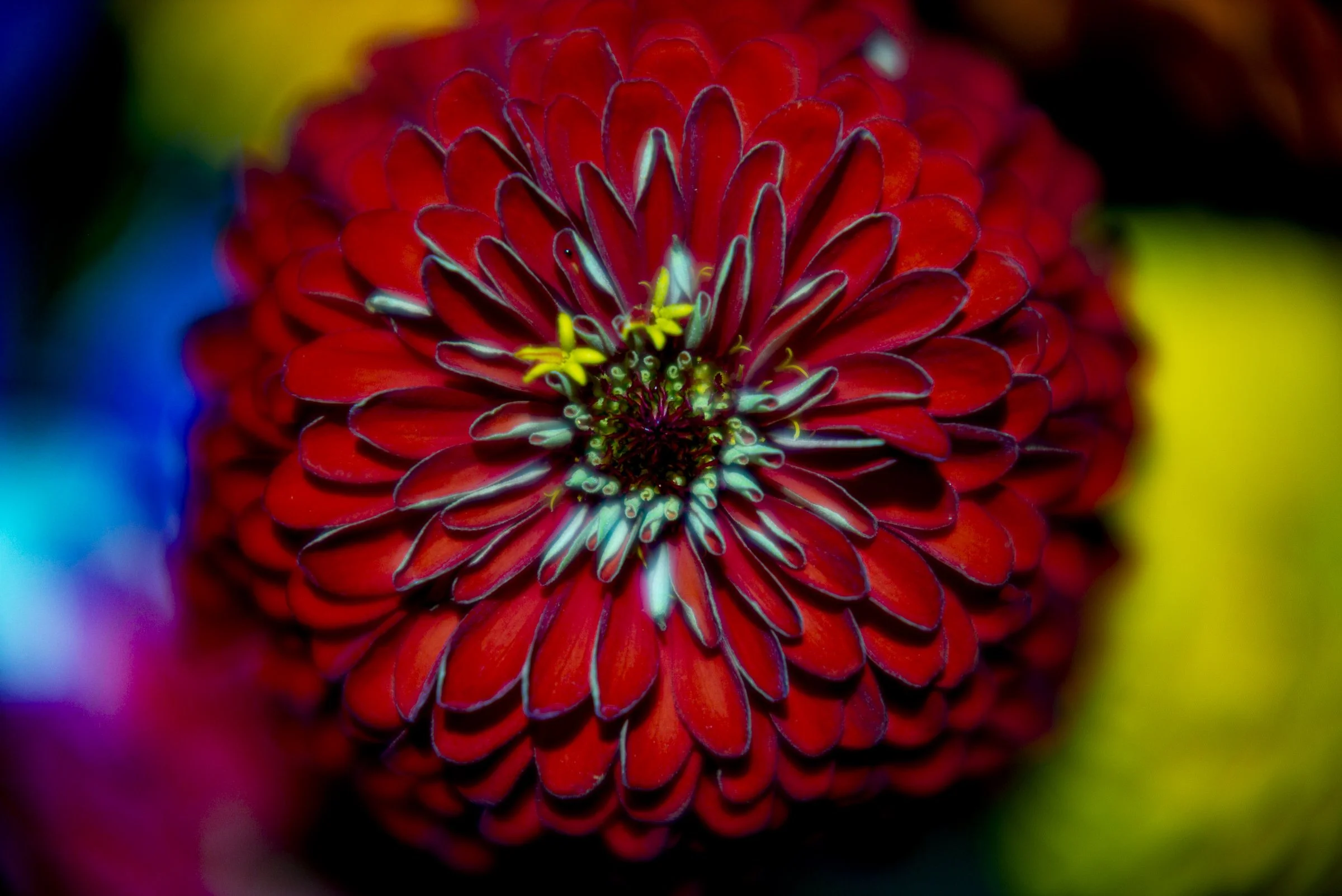 Close-up of a vibrant red flower with intricate petal details and a colorful blurred background. View fullsize