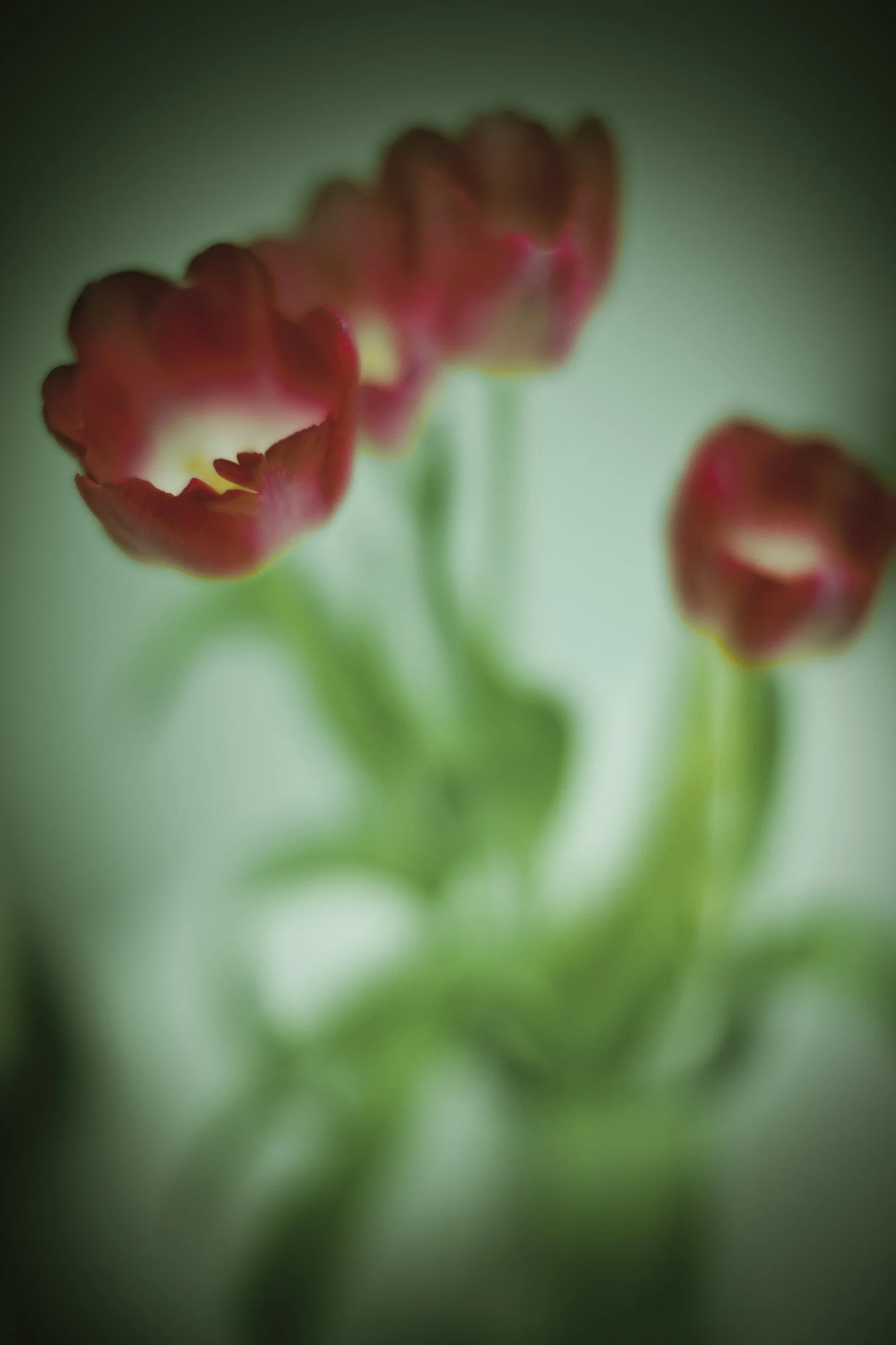 Blurry image of red tulips against a green background View fullsize