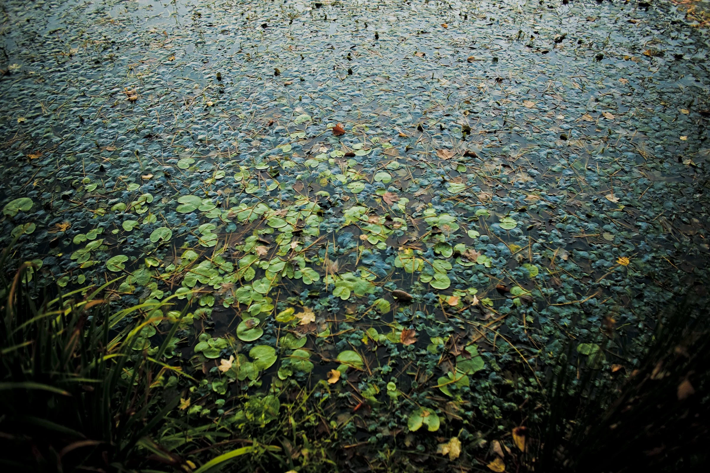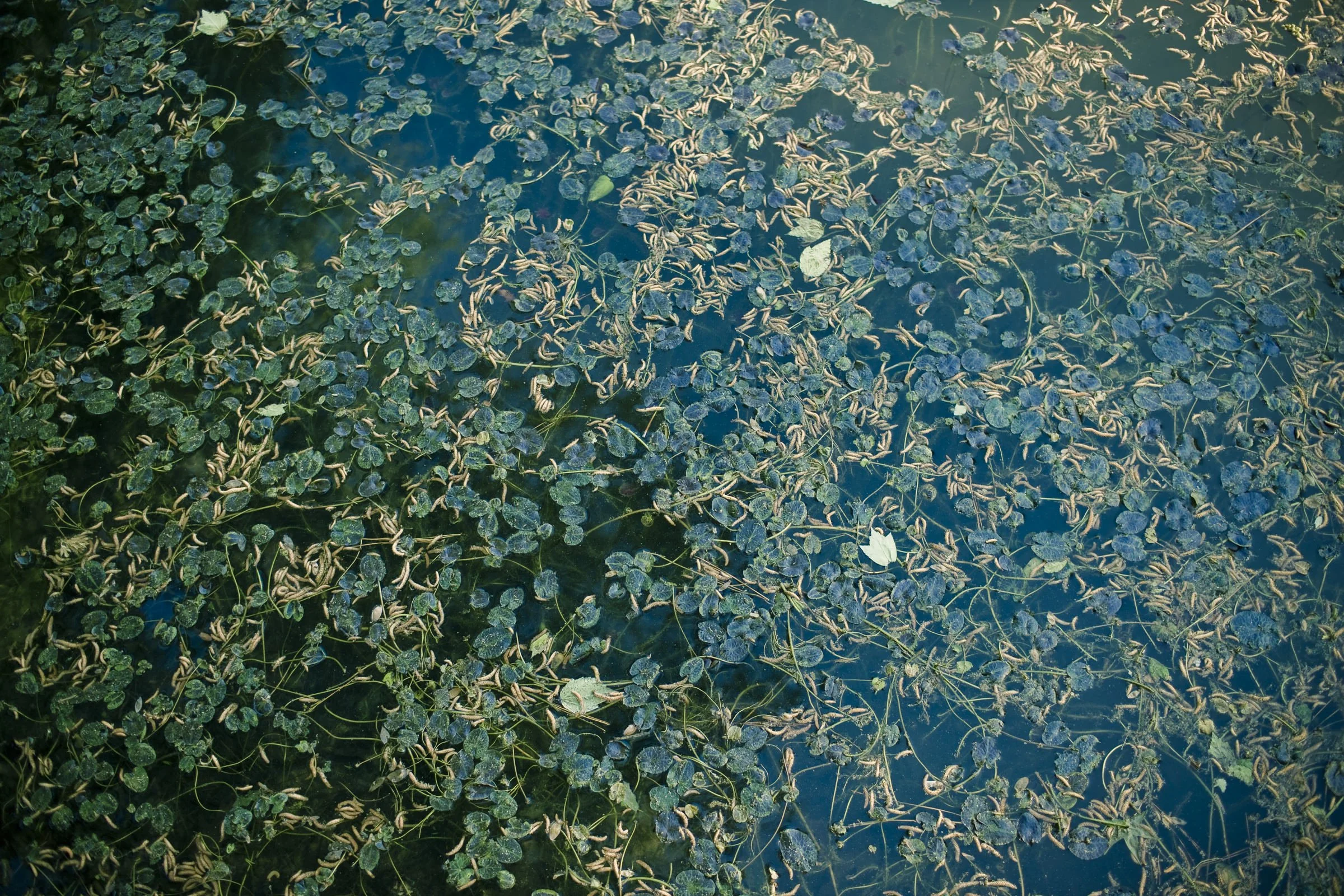 Pond surface covered with floating lily leaves and water plants. View fullsize