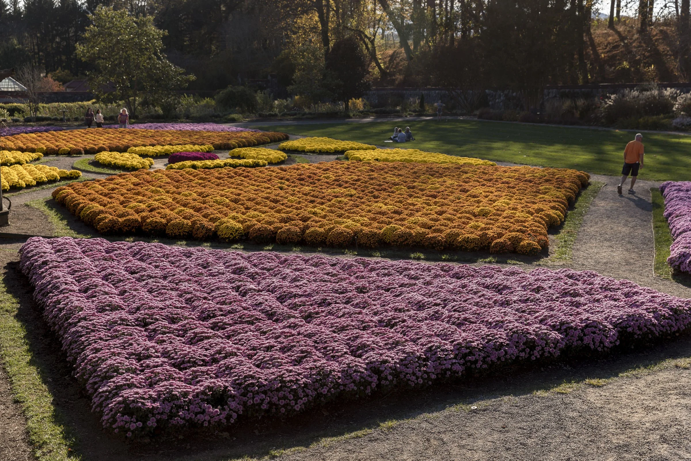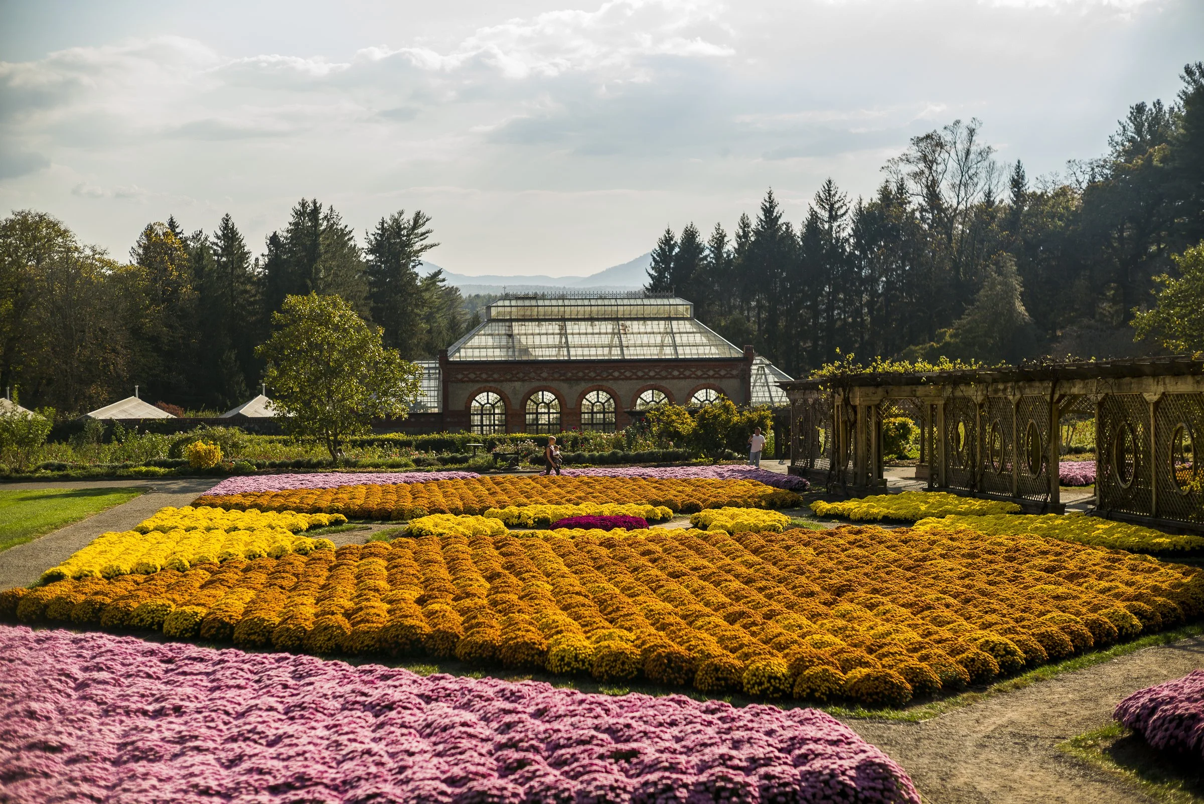 Formal garden with colorful flower beds, a glass greenhouse, and a tree-lined background. View fullsize