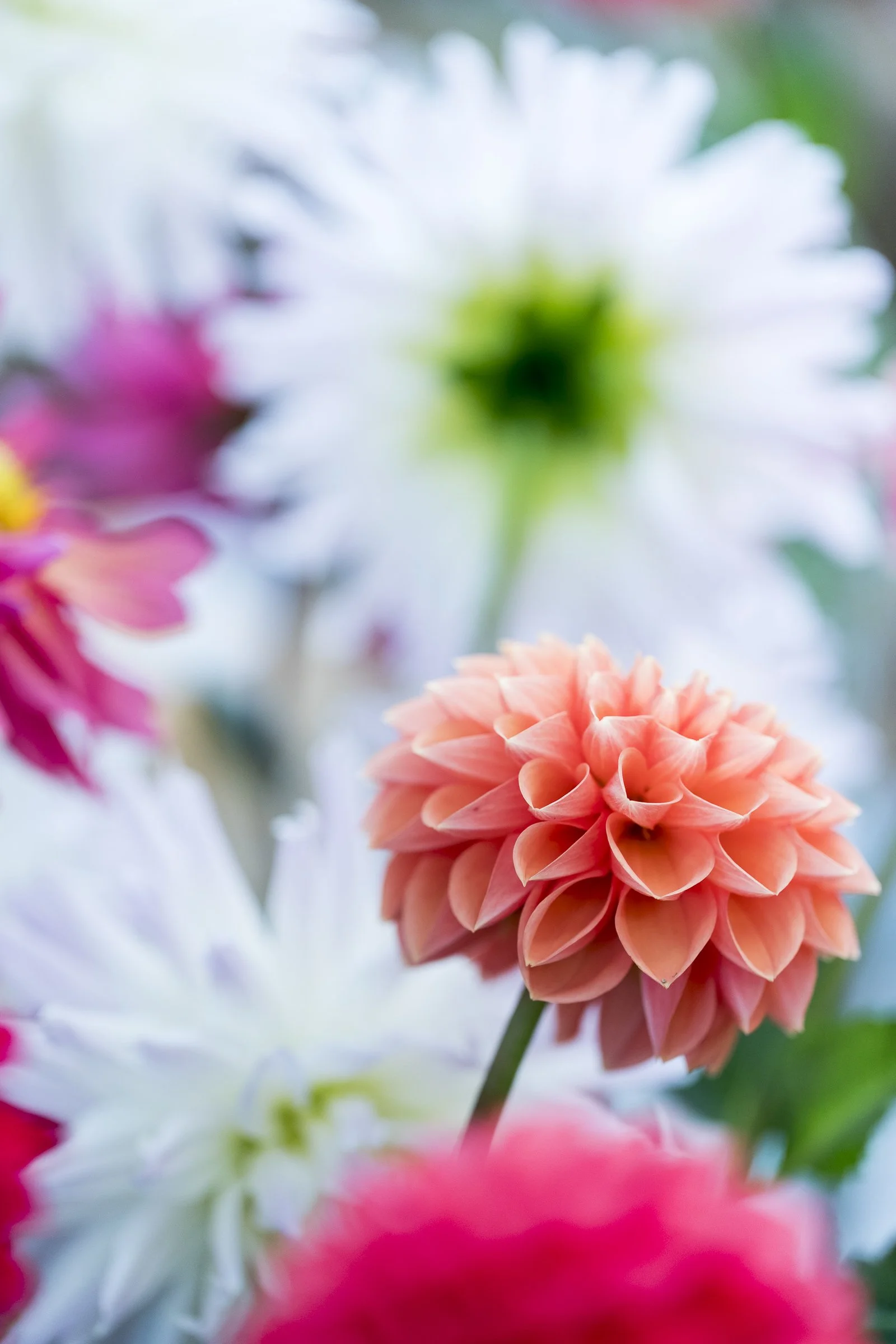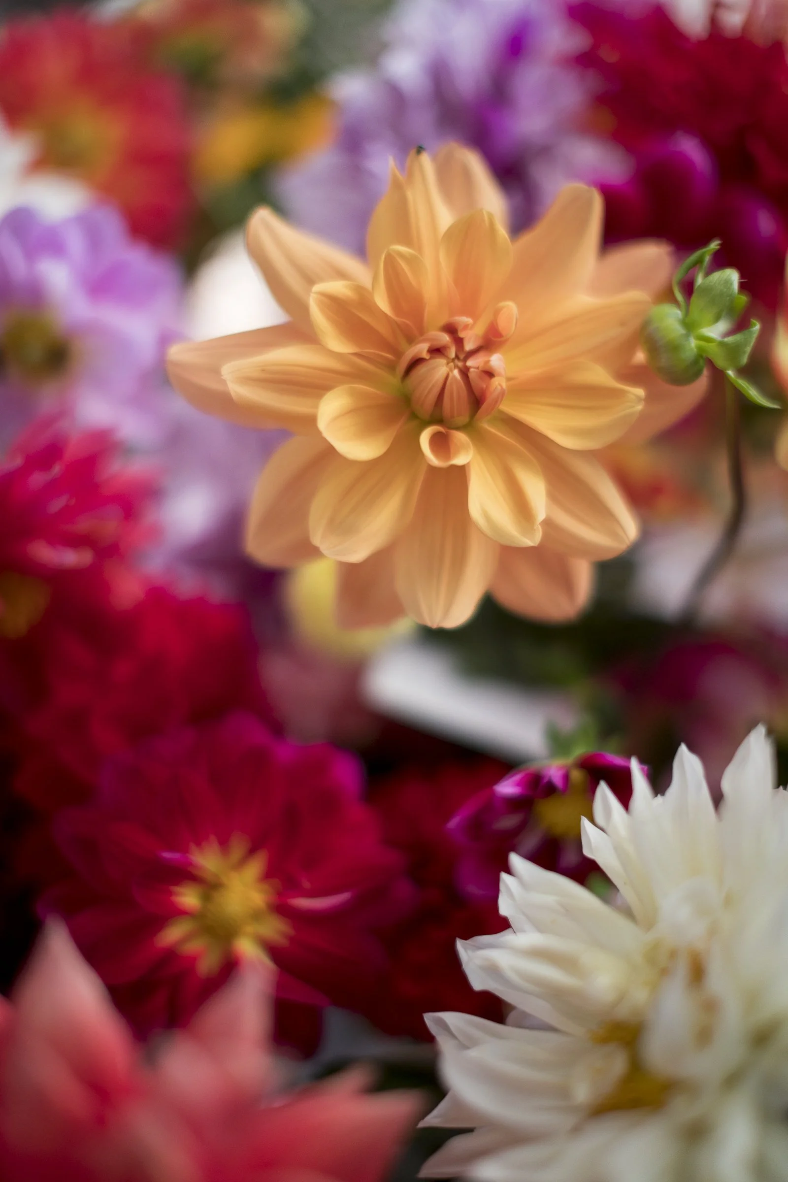 Close-up of various colorful dahlia flowers with a peach-colored dahlia in focus. View fullsize