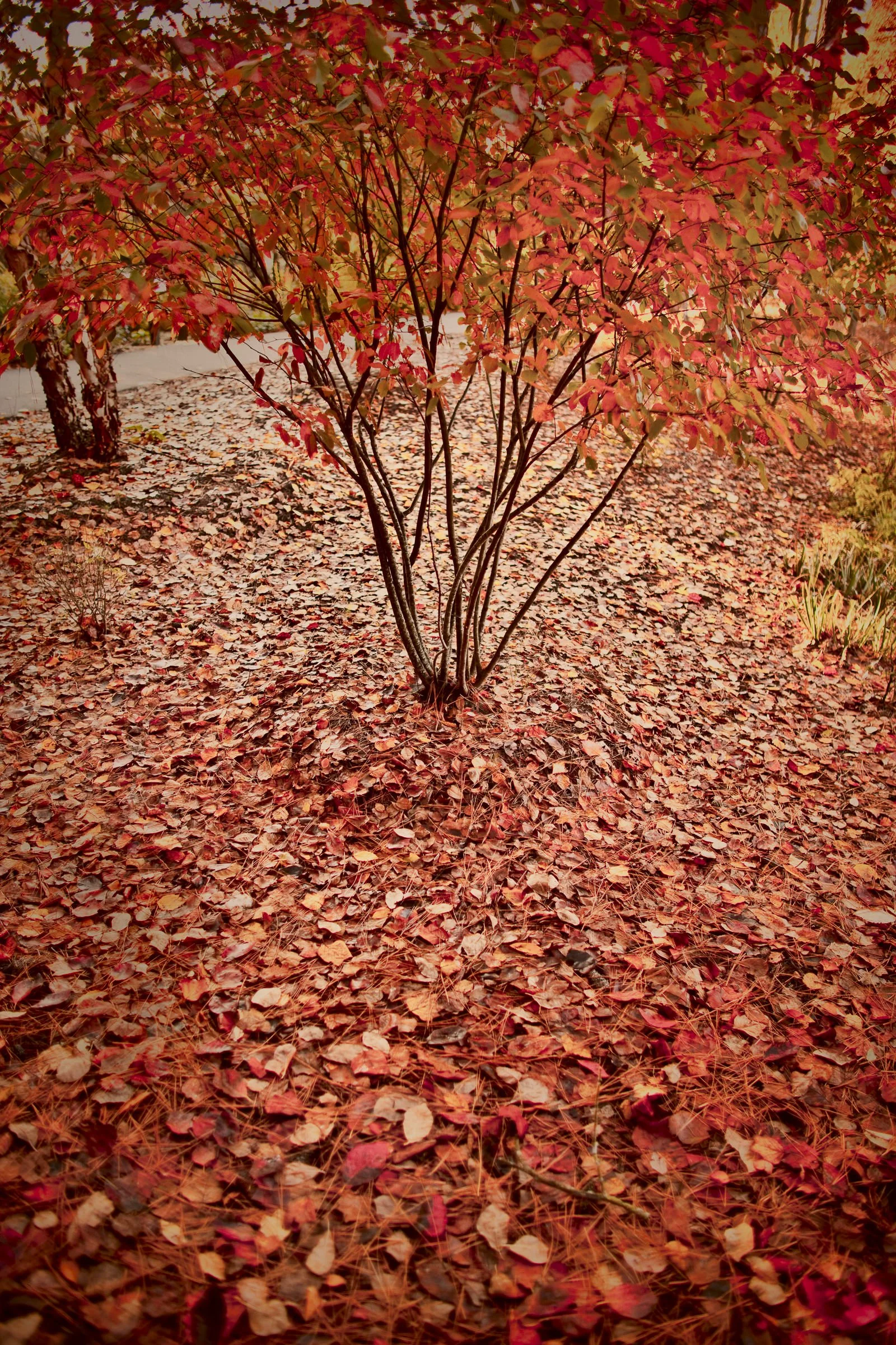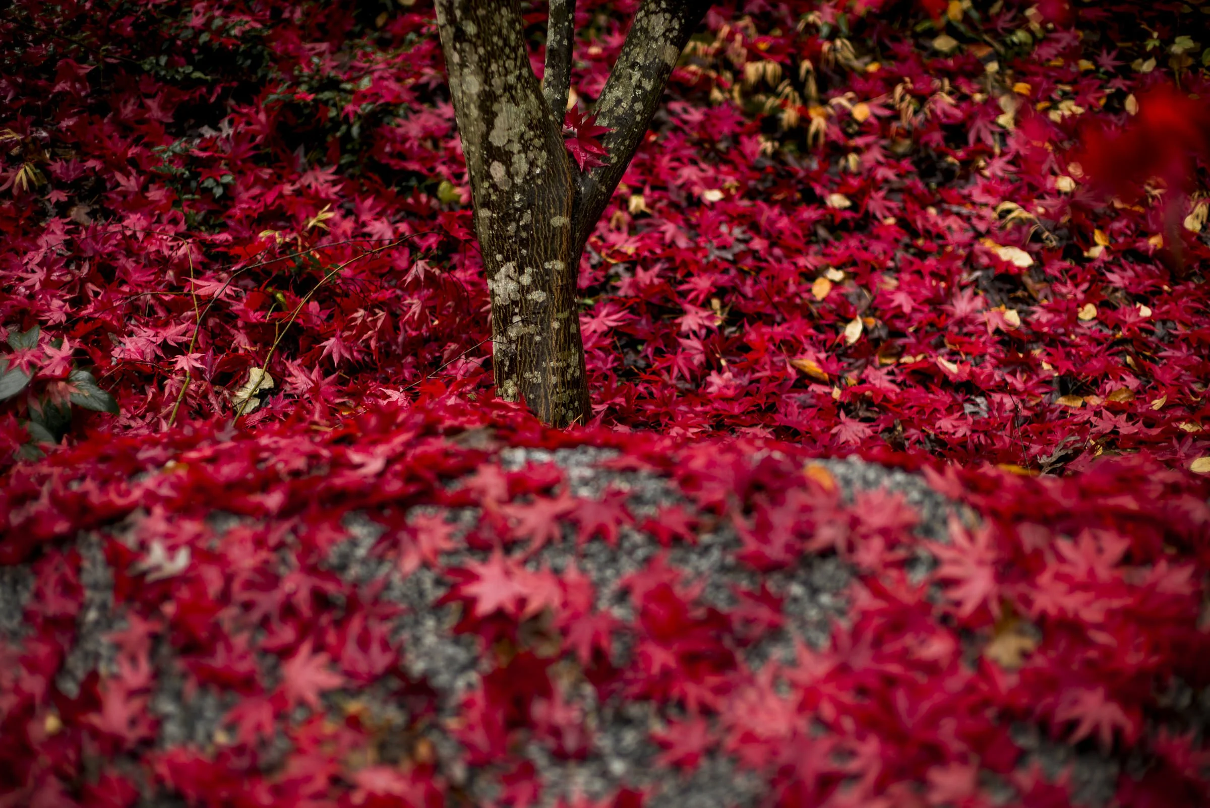 Tree surrounded by vibrant red autumn leaves covering the ground, with a blurred foreground of leaves and rocks. View fullsize