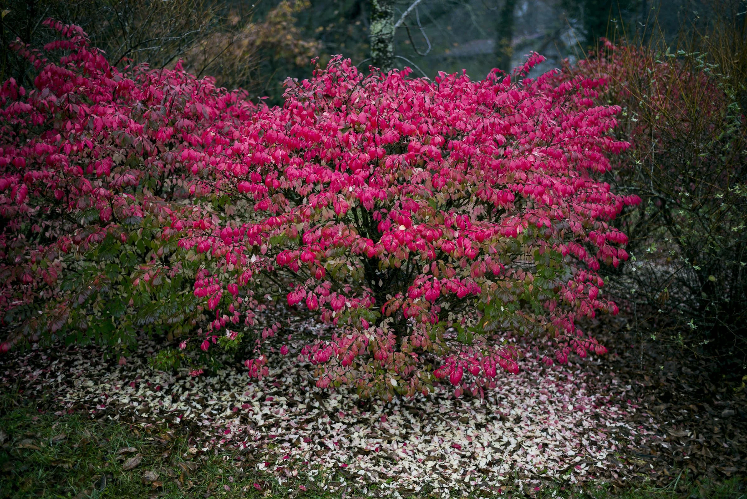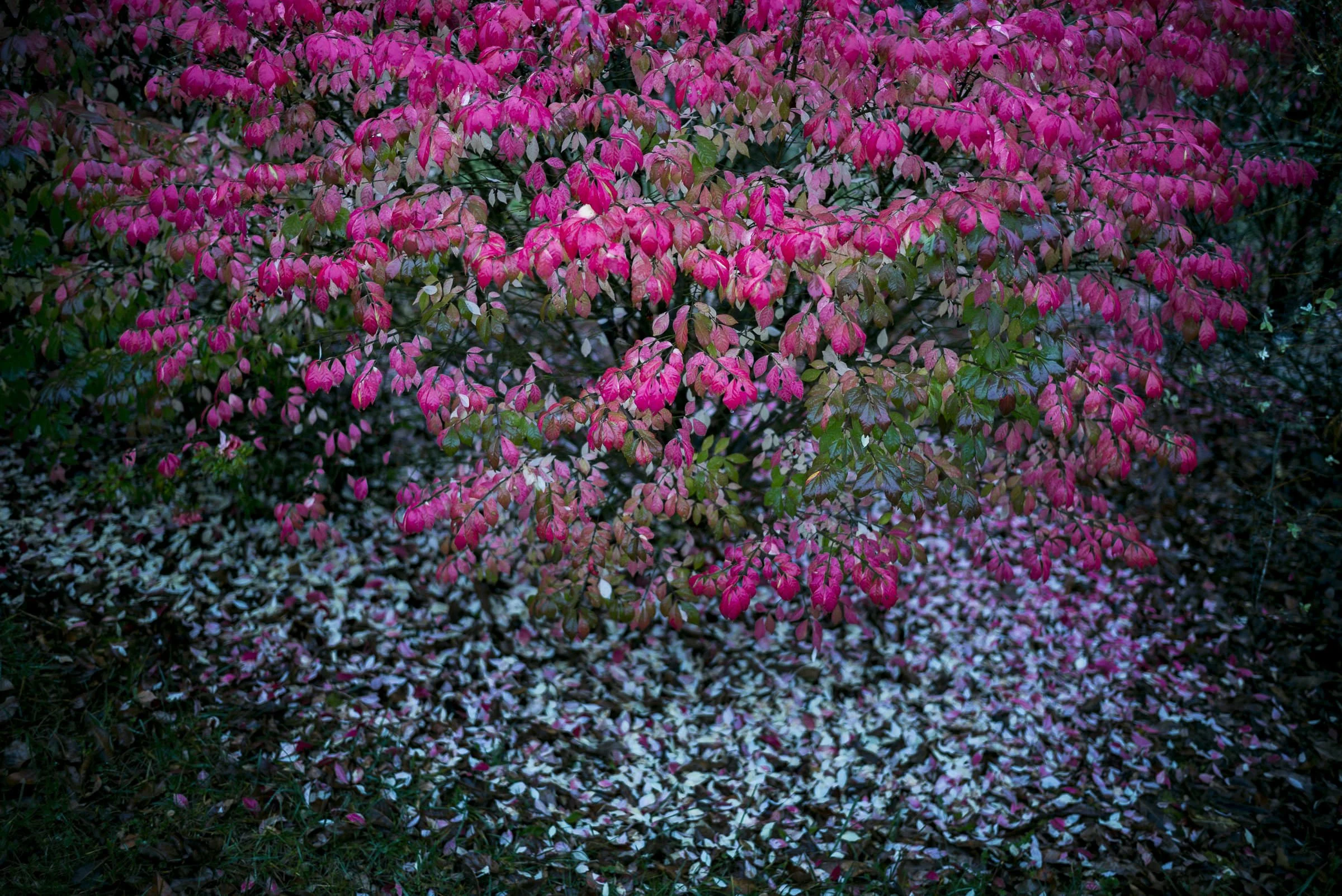 Vibrant pink burning bush with fallen leaves on the ground.