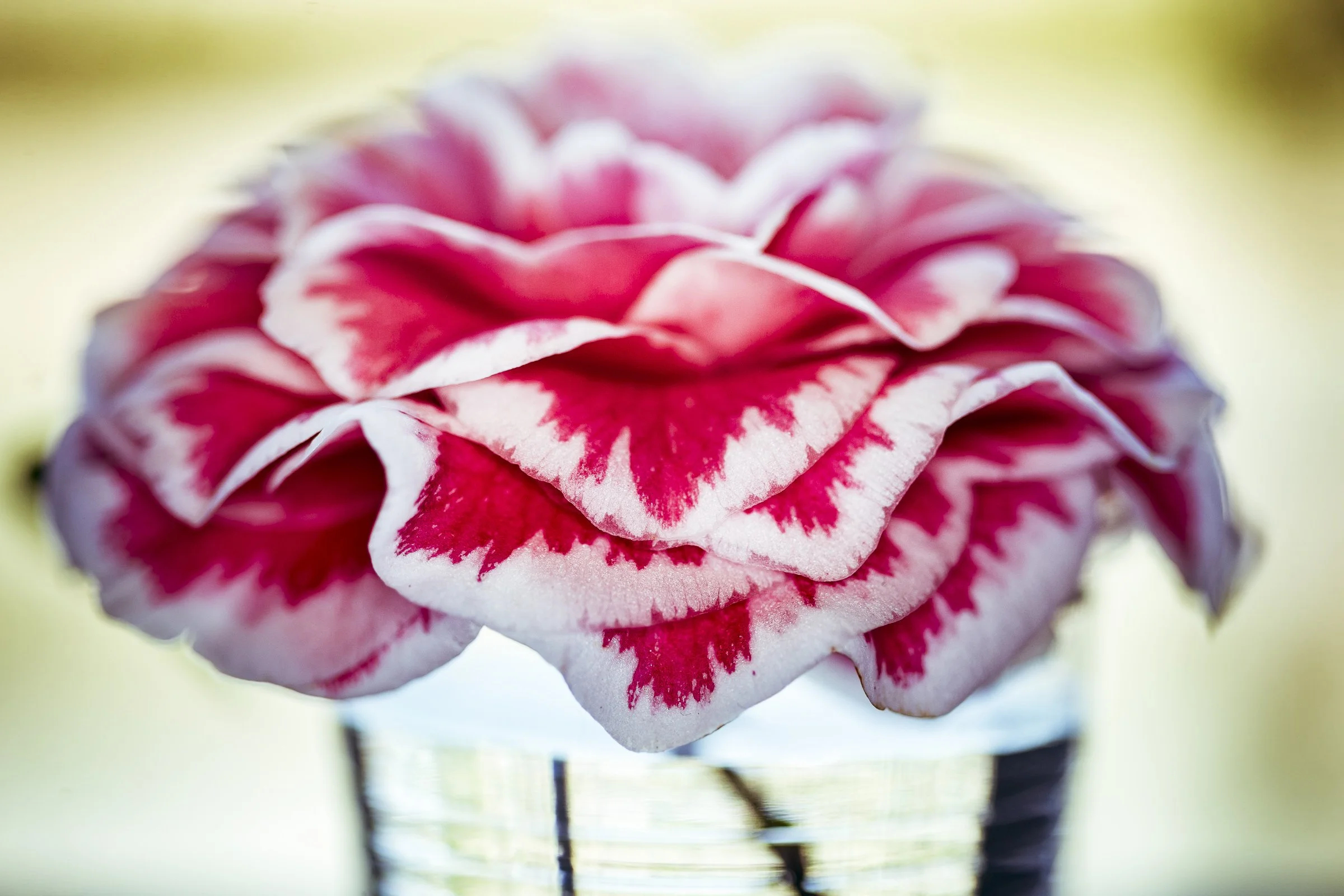 Close-up of a pink and white carnation flower in focus with blurred background. View fullsize