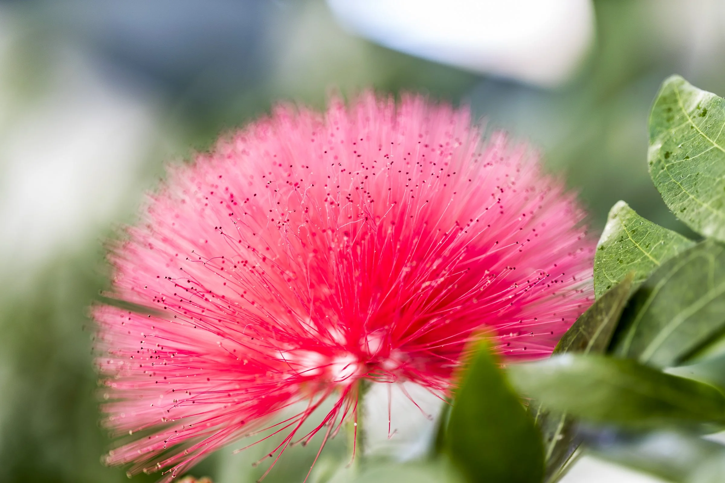 Close-up of a pink powder puff flower with green leaves in the background.