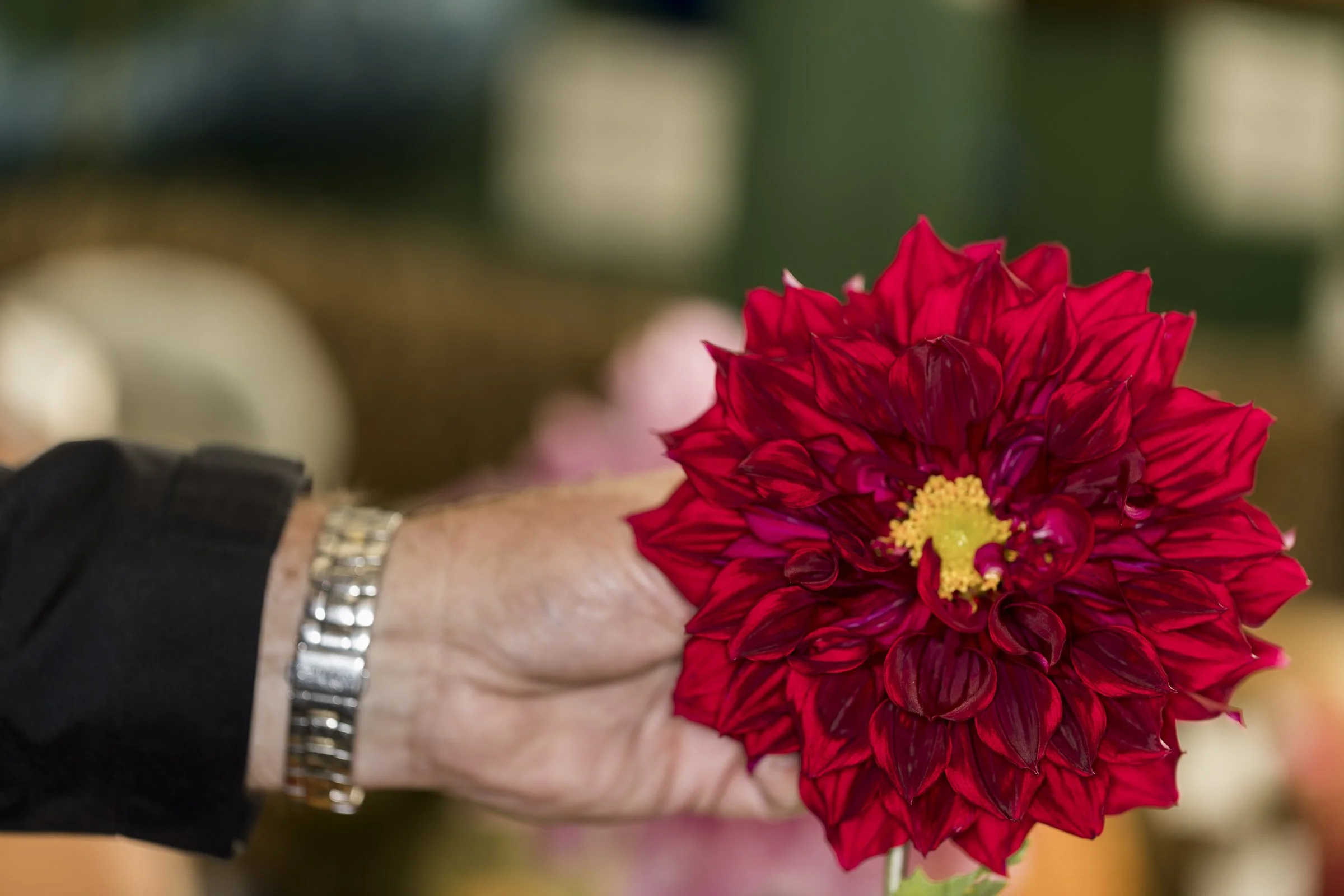 Person holding a vibrant red dahlia flower