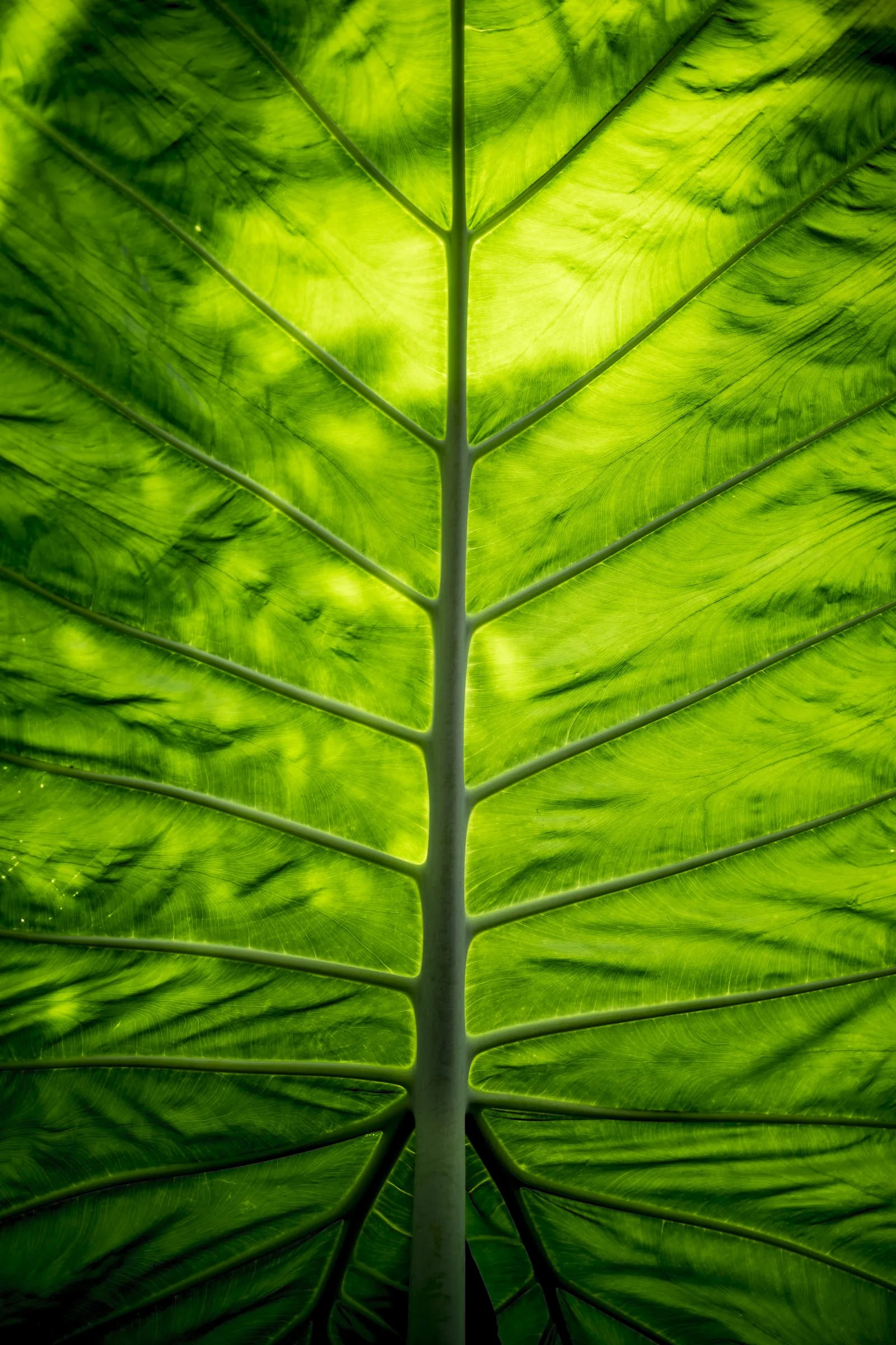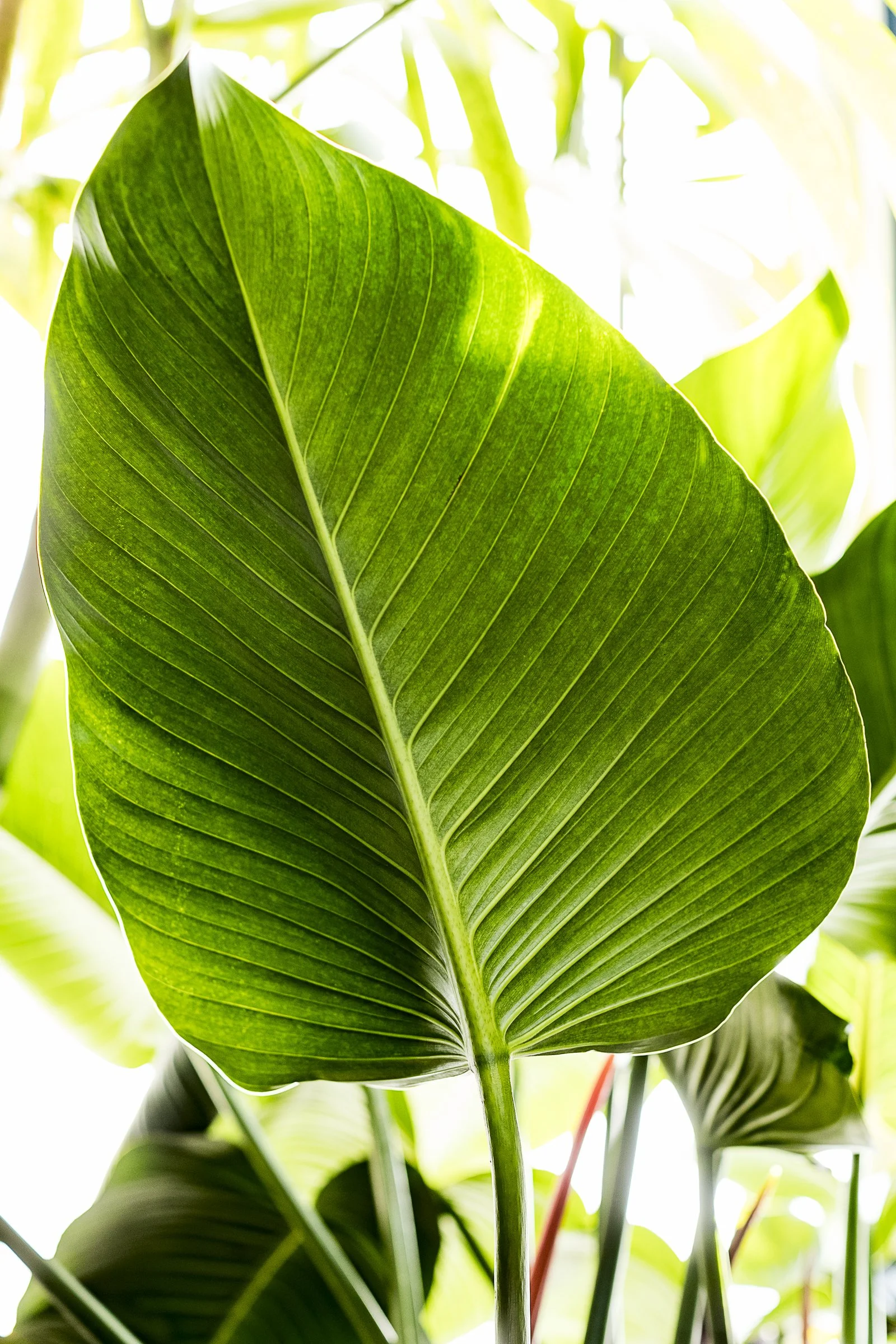 Close-up of a large green tropical leaf with visible veins and sunlight filtering through.