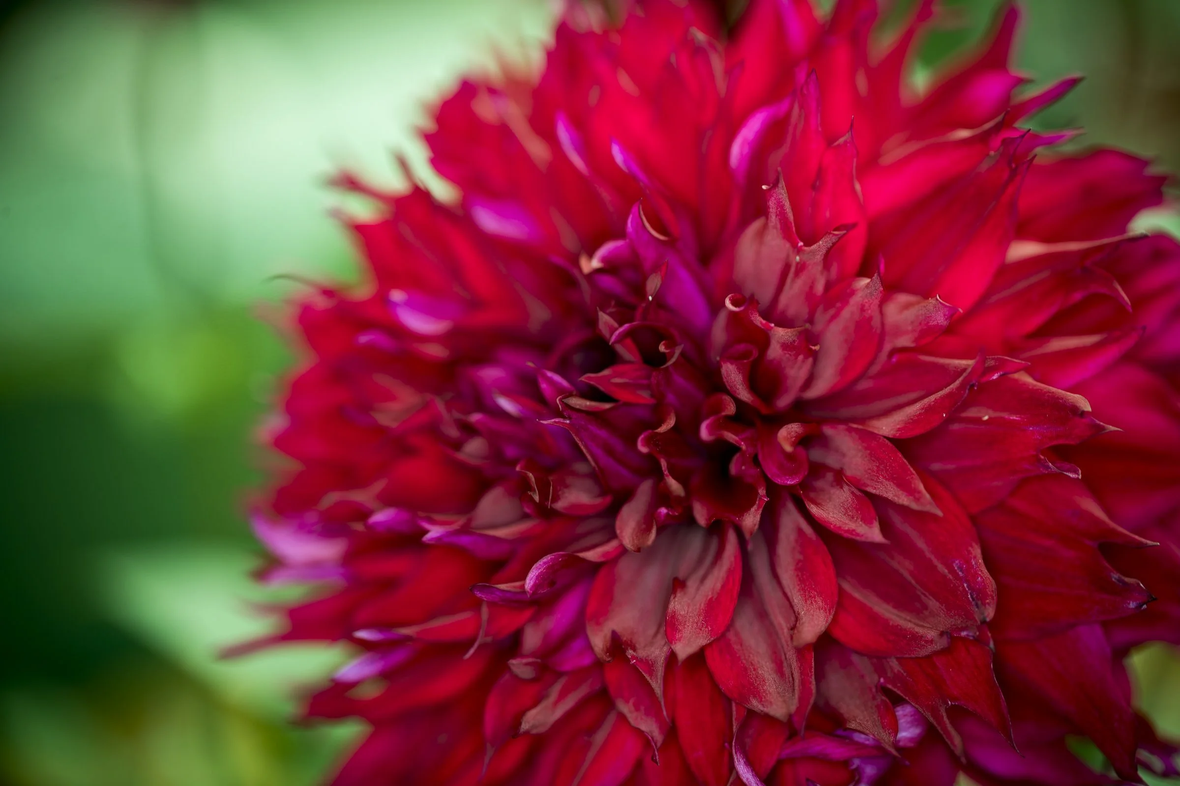 Close-up of a red dahlia flower with layered petals and blurred green background.