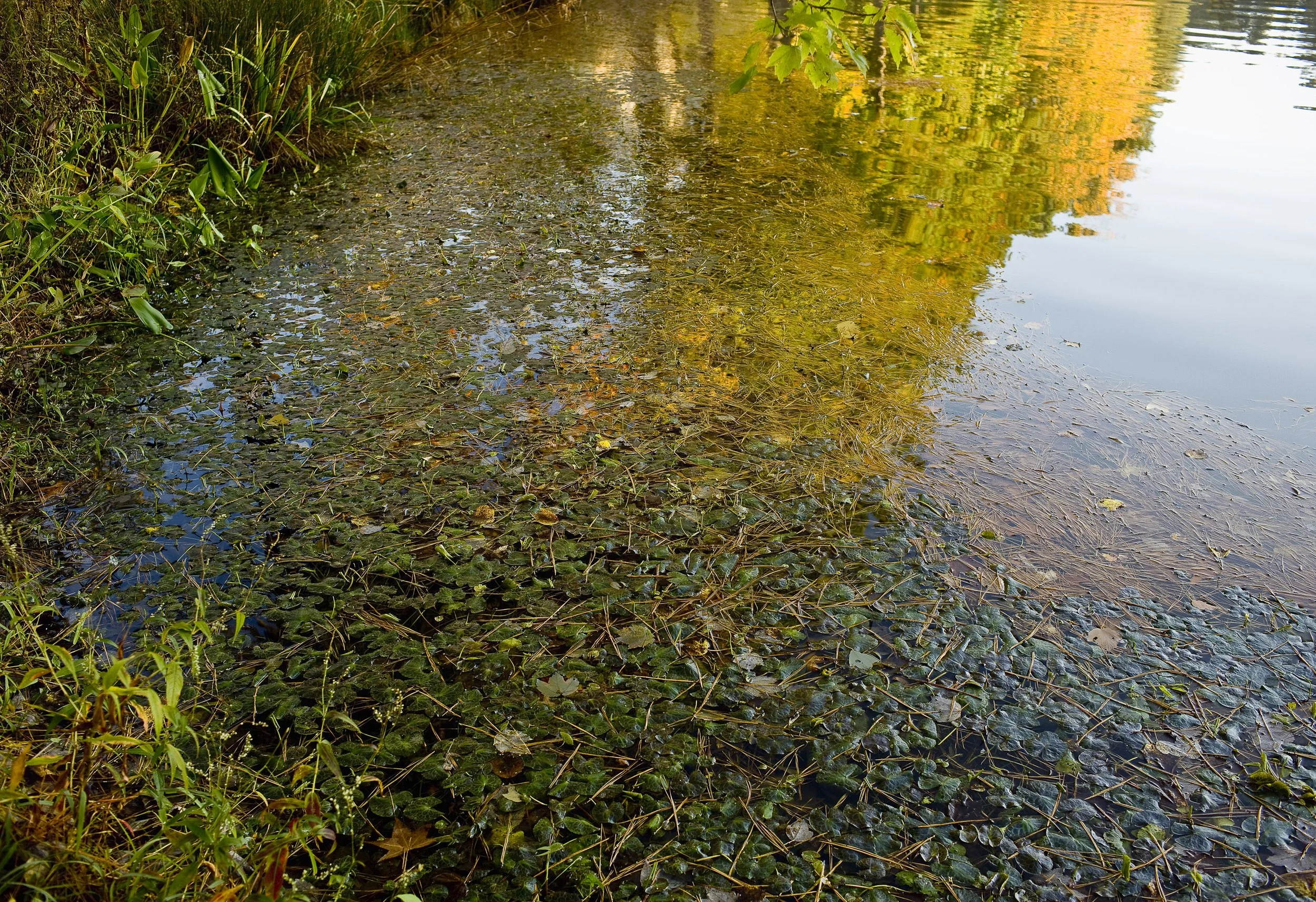 Pond with water plants and reflection of trees in autumn colors.