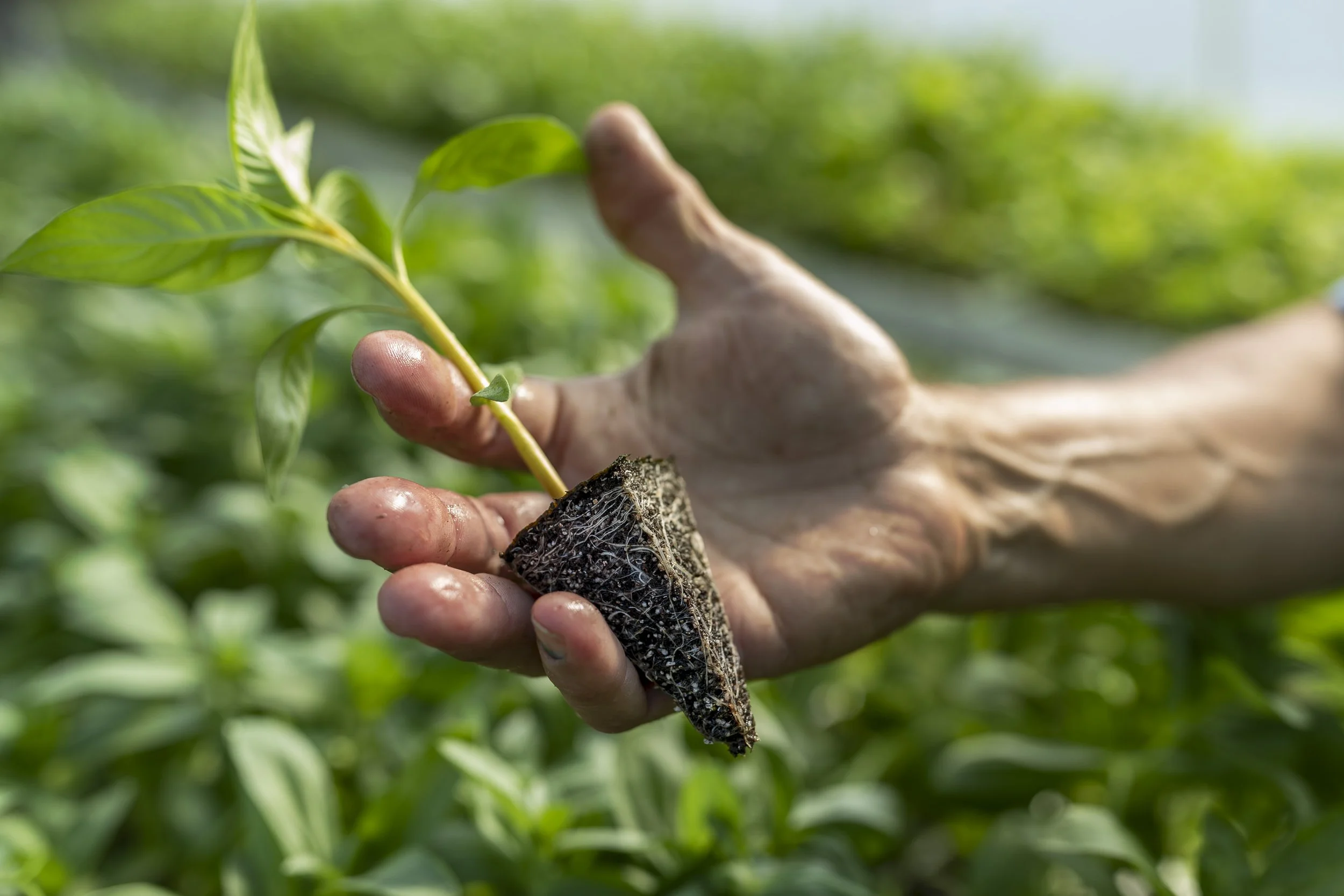 Close-up of a hand holding a young plant with roots in soil.