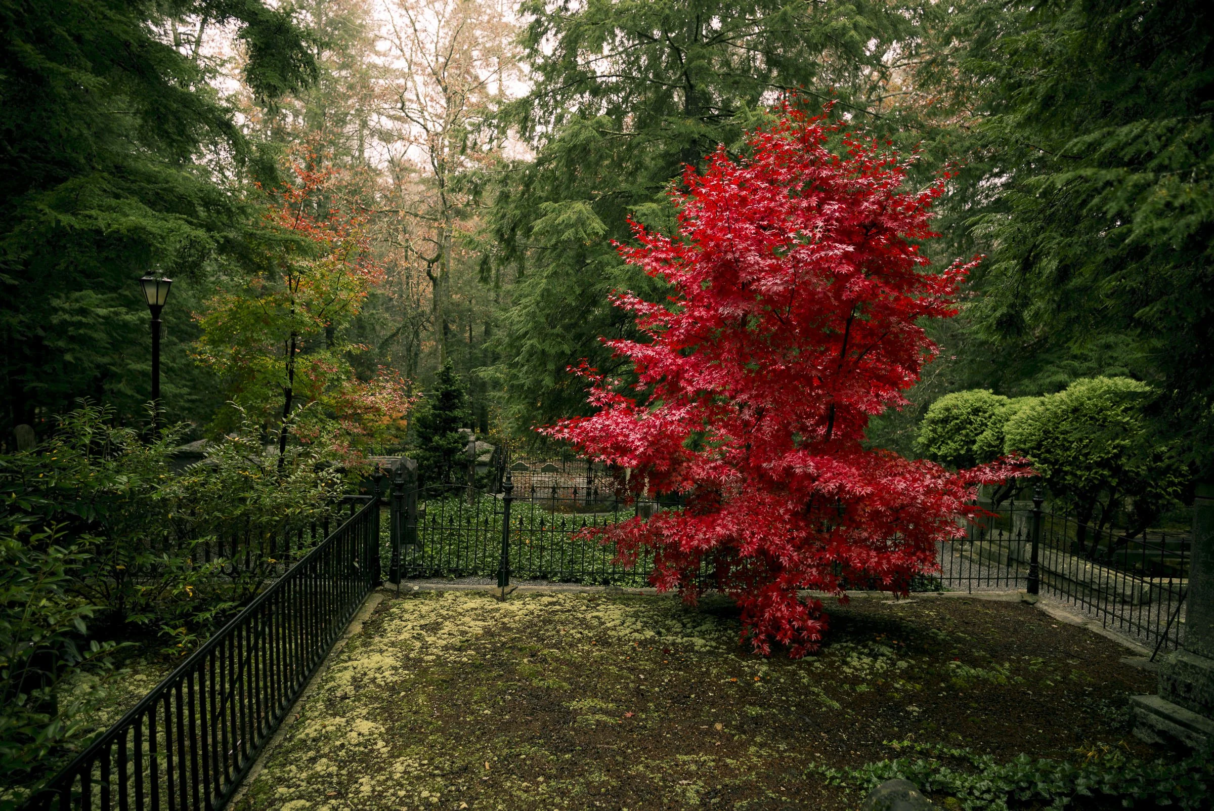 A bright red tree in a lush green park surrounded by iron fencing. View fullsize