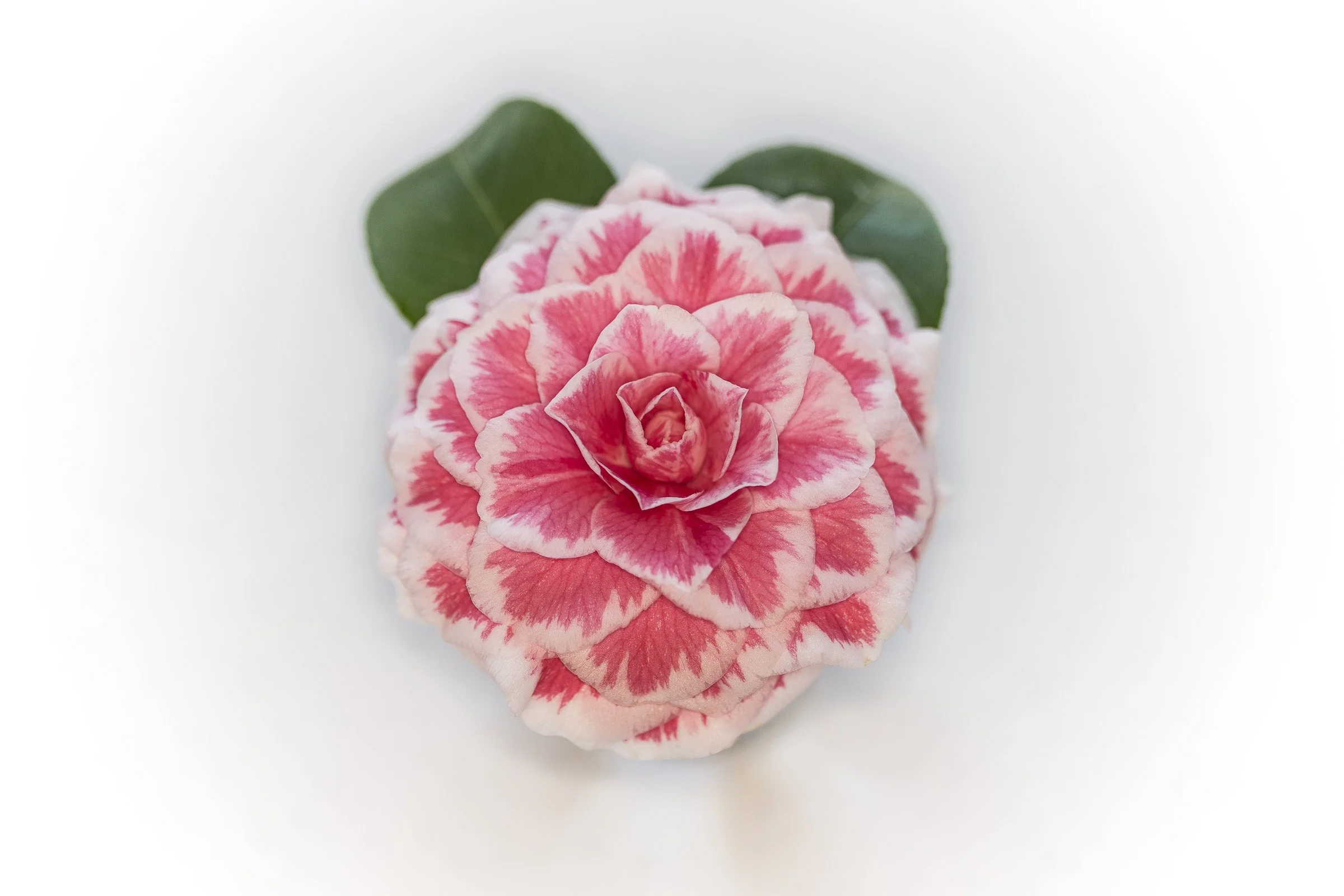 Pink and white camellia flower with green leaves on a white background.