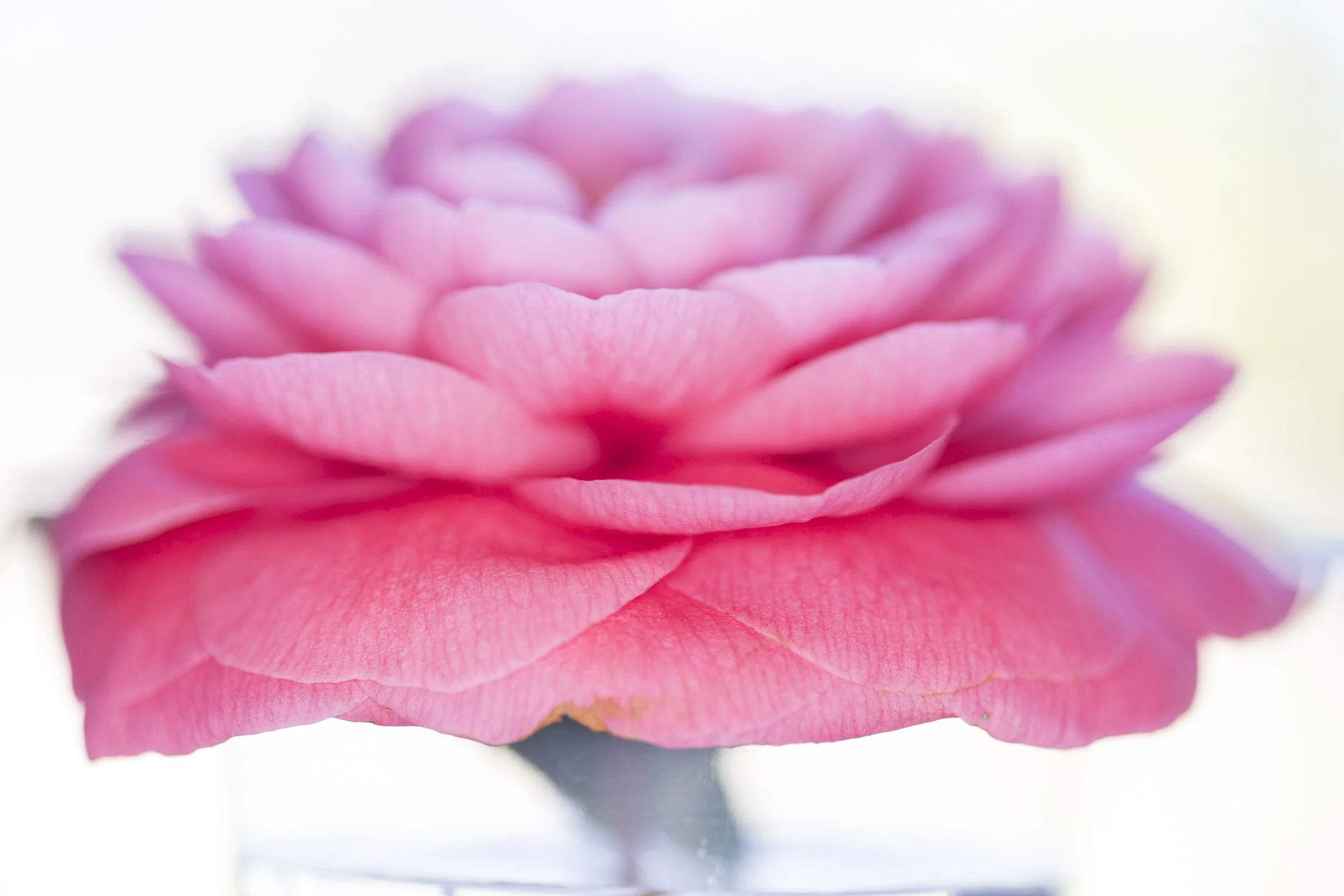 Close-up of a pink camellia flower with soft-focus petals. View fullsize