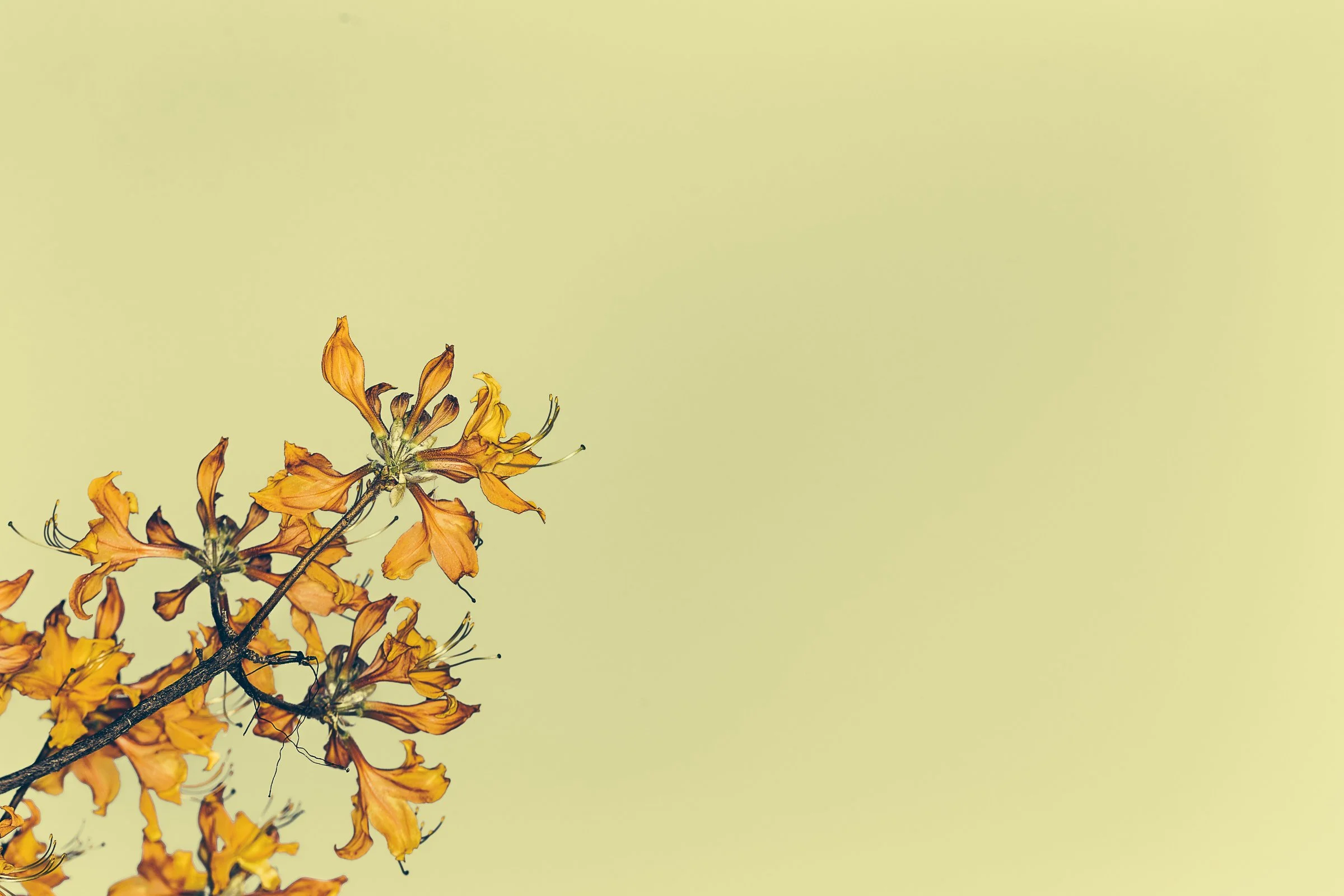 Branch with orange flowers against a pale yellow background. View fullsize