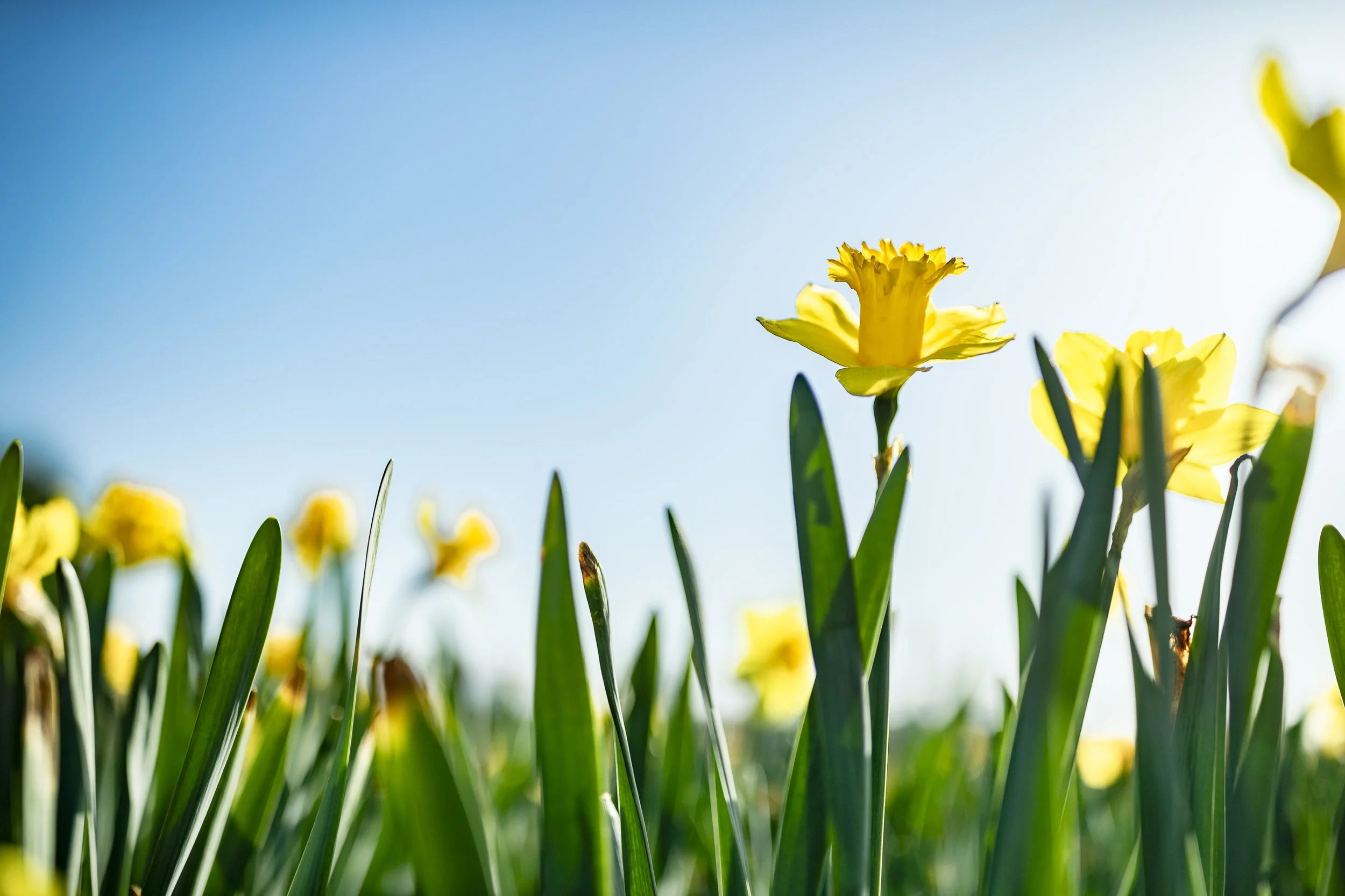 Low angle view of yellow daffodils with green leaves against a clear blue sky.