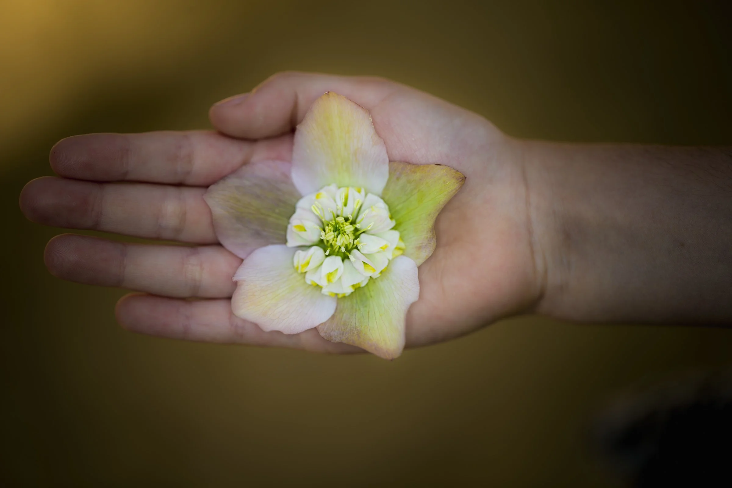 A hand holding a hellebore flower with pale pink and green petals.