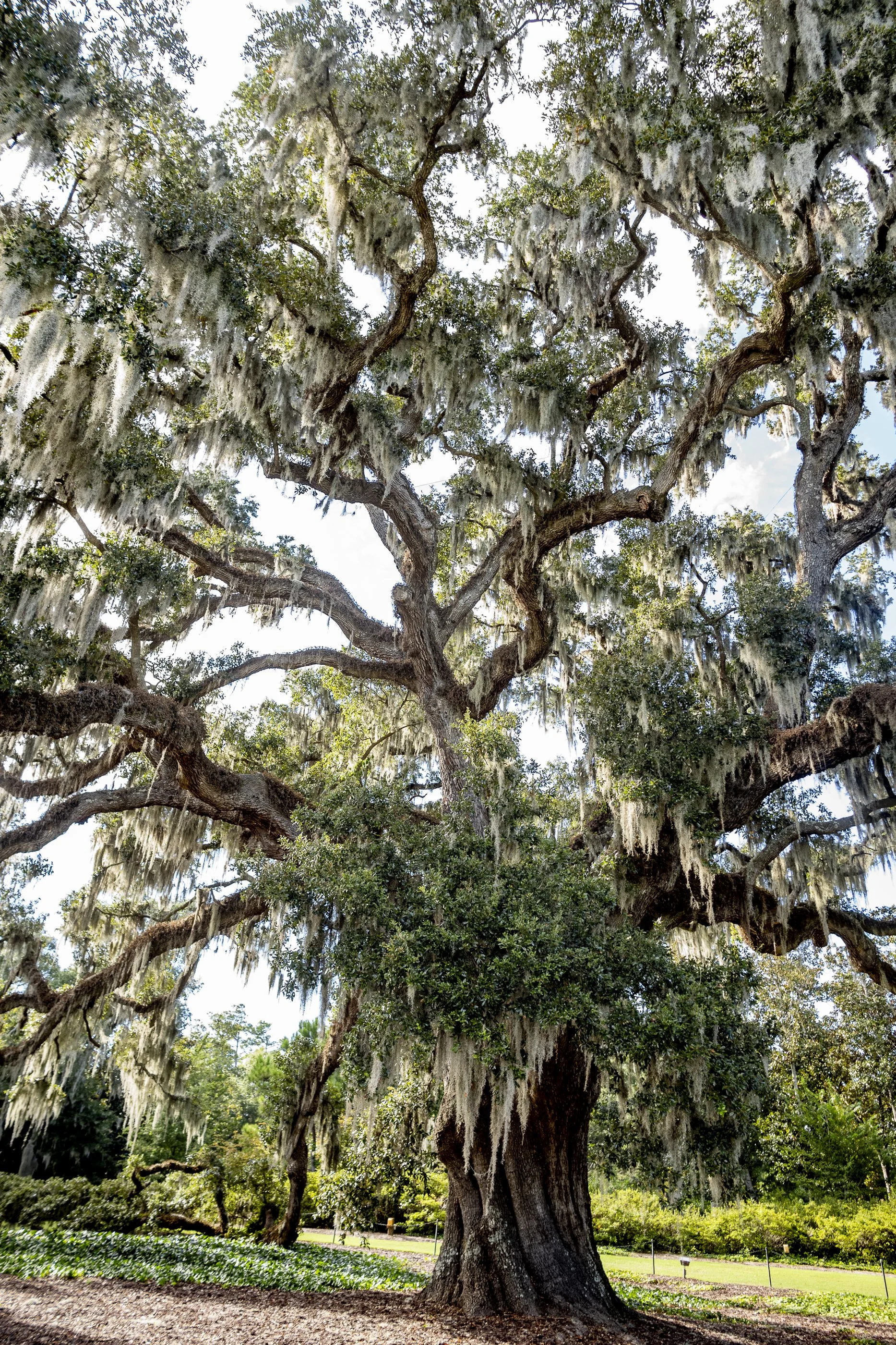 Large oak tree covered with Spanish moss in a garden setting.