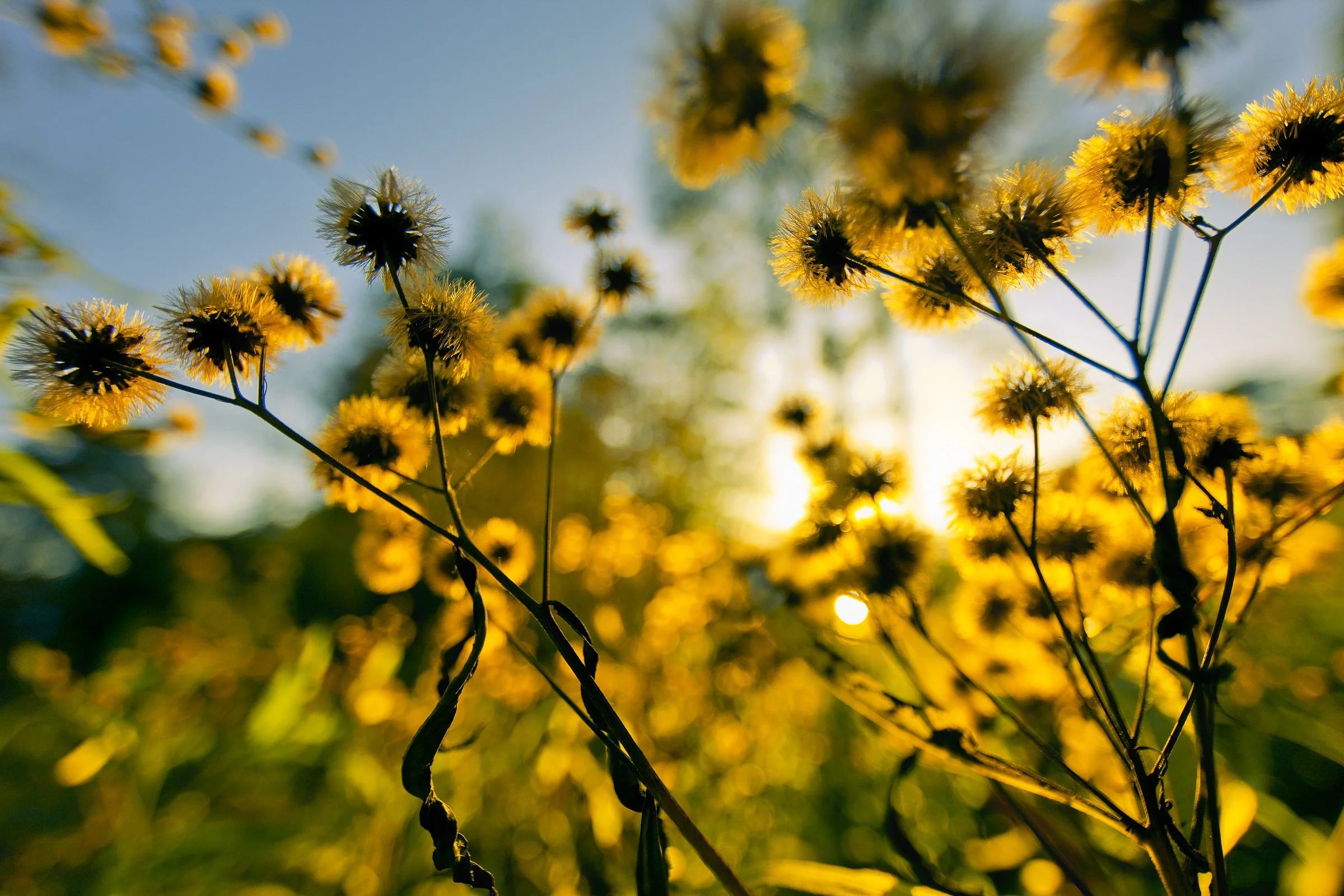Close-up of yellow wildflowers against a sunlight background, with blurred bokeh effect.