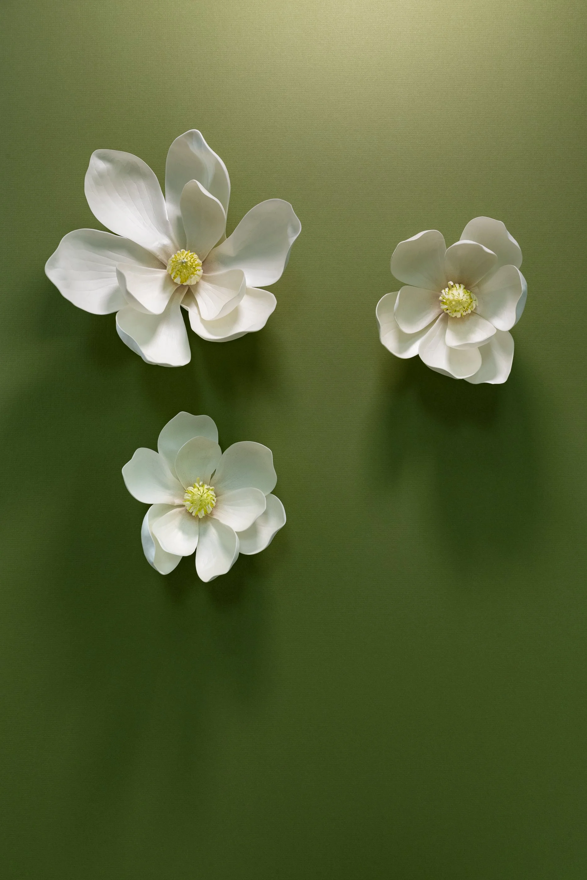 Three white magnolia flowers on a green background.