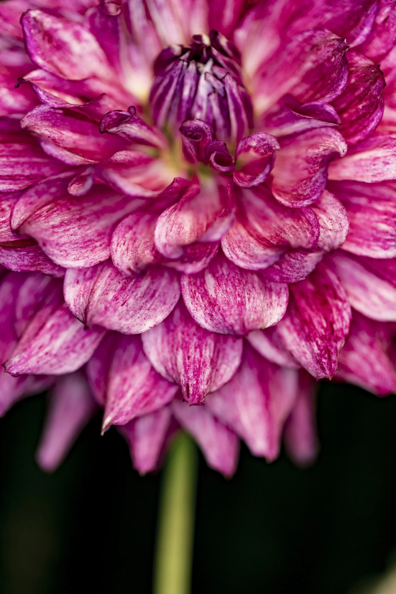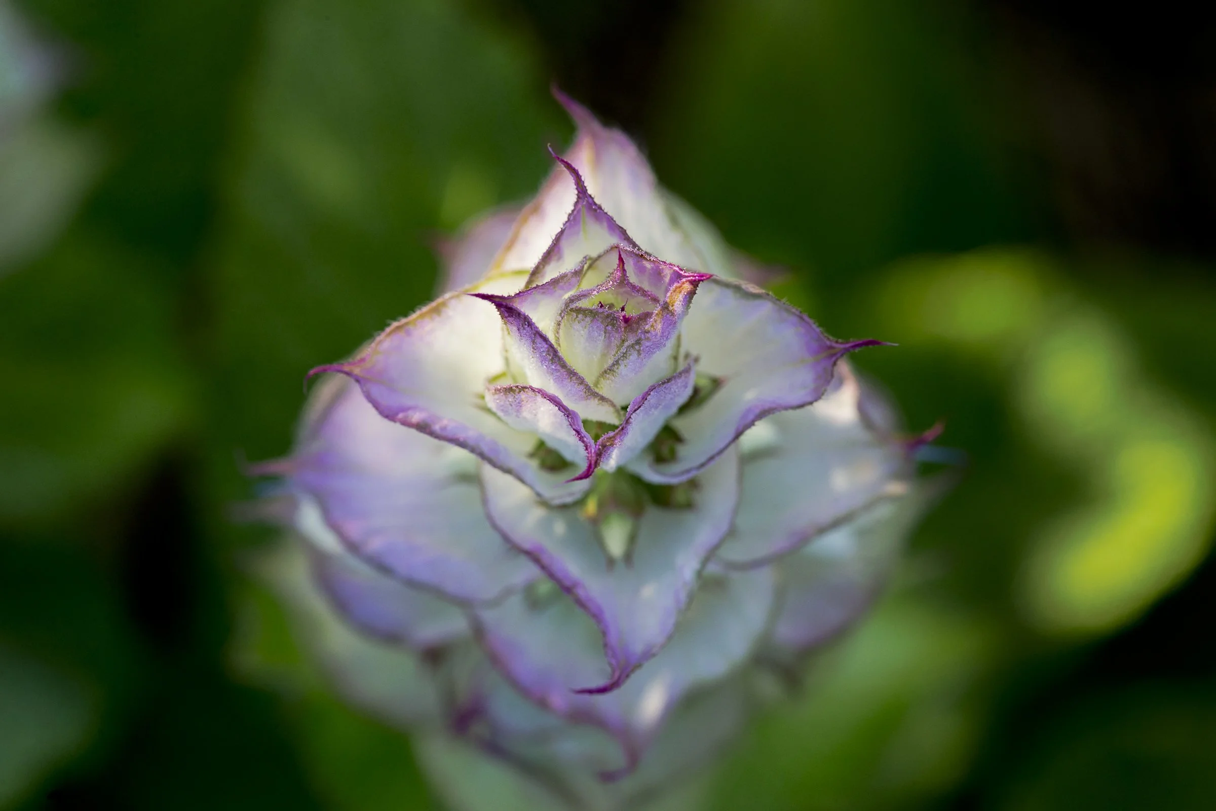 Close-up of a green and purple flower with layered petals