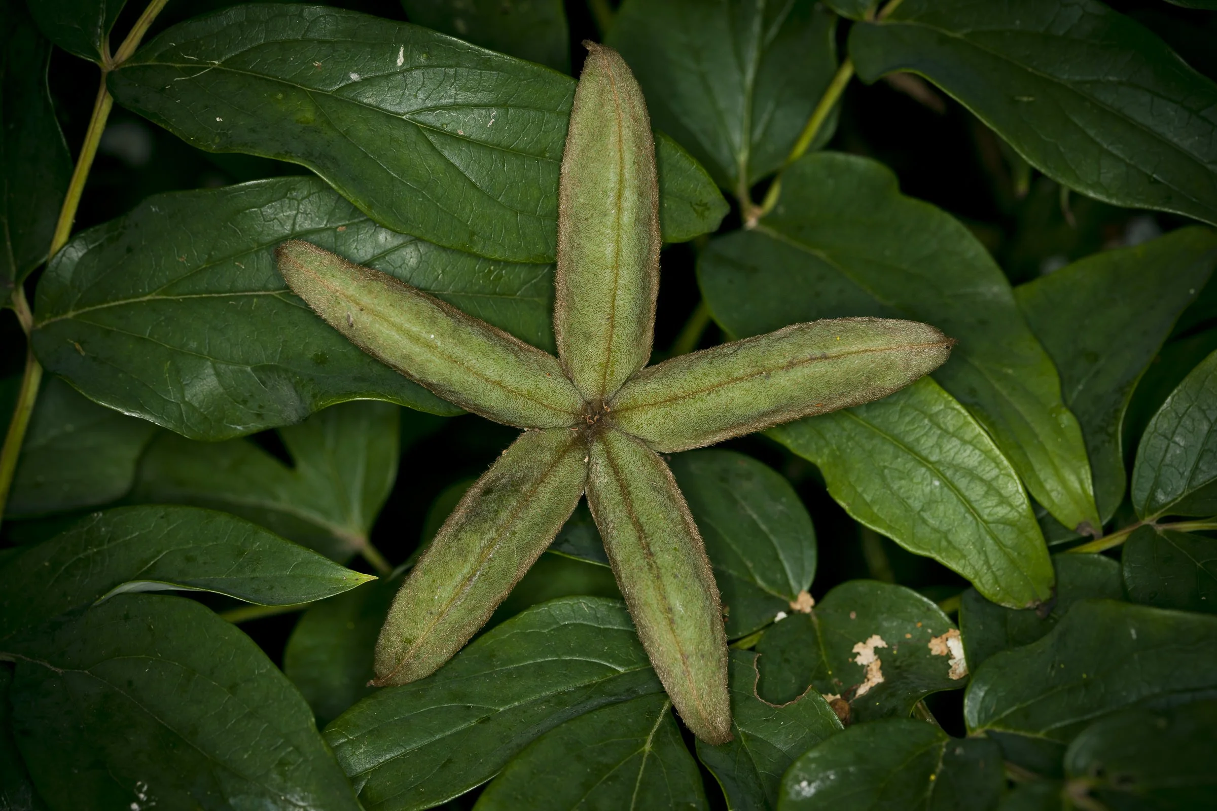 Star-shaped green seed pod surrounded by dark green leaves. View fullsize