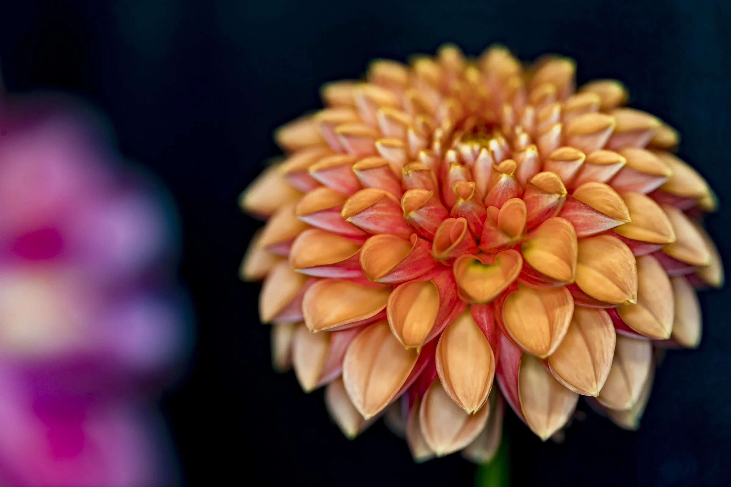 Close-up of an orange and pink dahlia flower with a blurred background. View fullsize