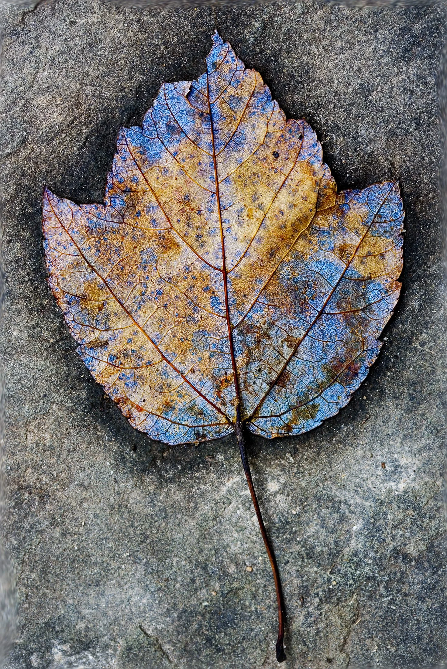 A close-up of a colorful leaf with blue and yellow hues, lying on a gray stone surface. View fullsize