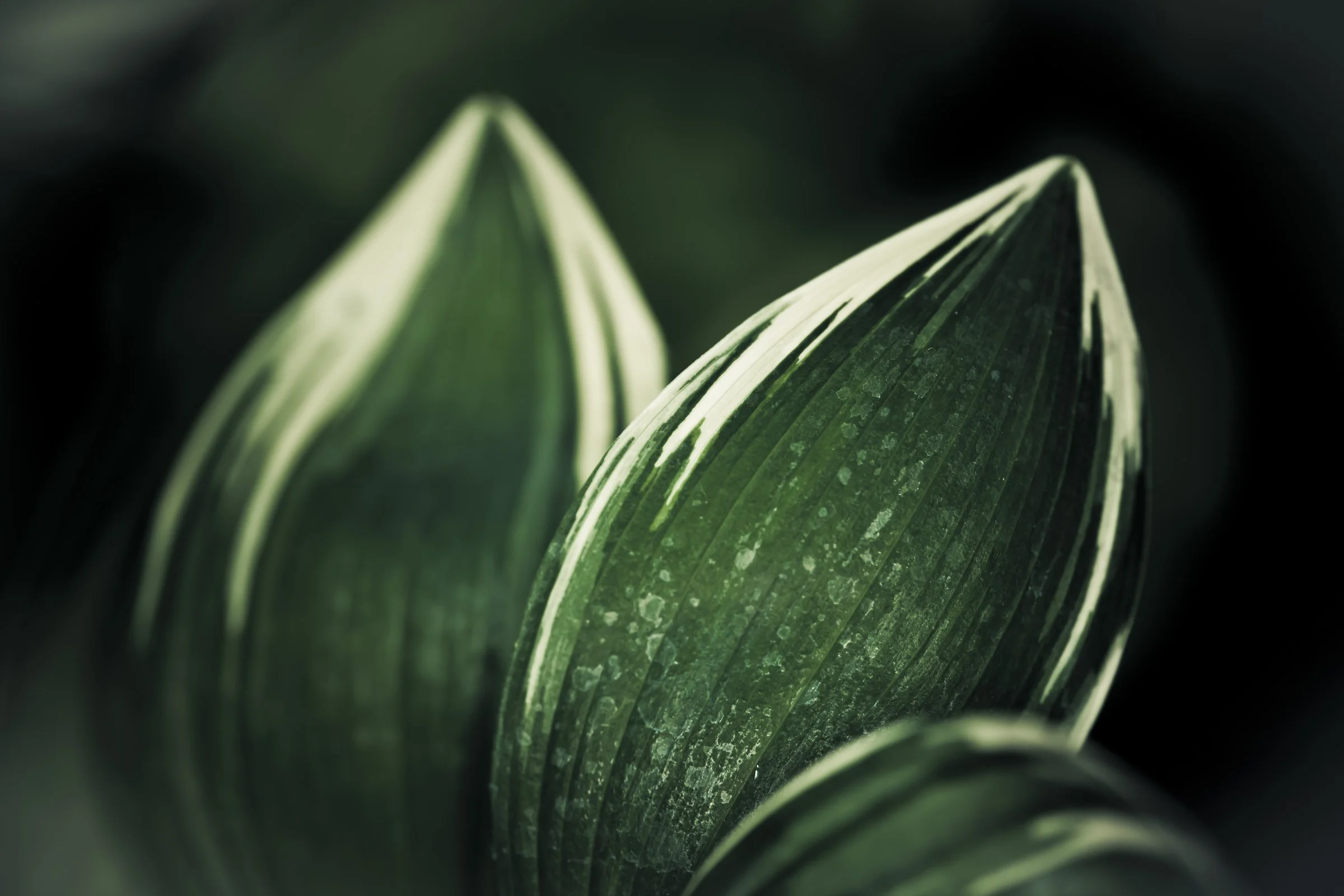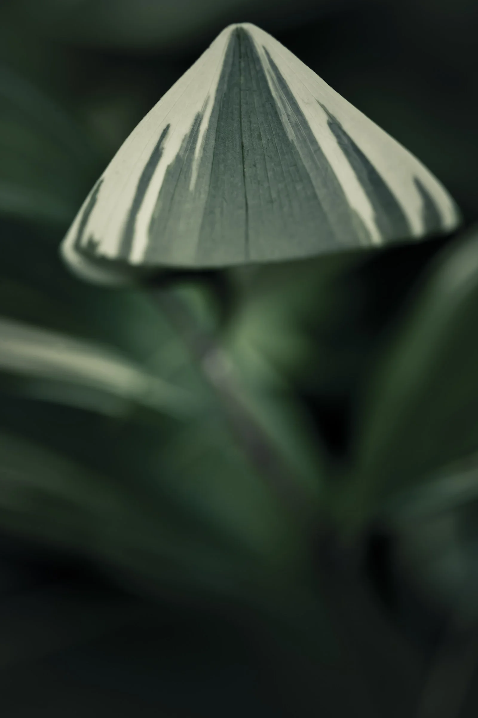 Close-up of pointed green leaves with white stripes, showcasing natural texture and pattern. View fullsize