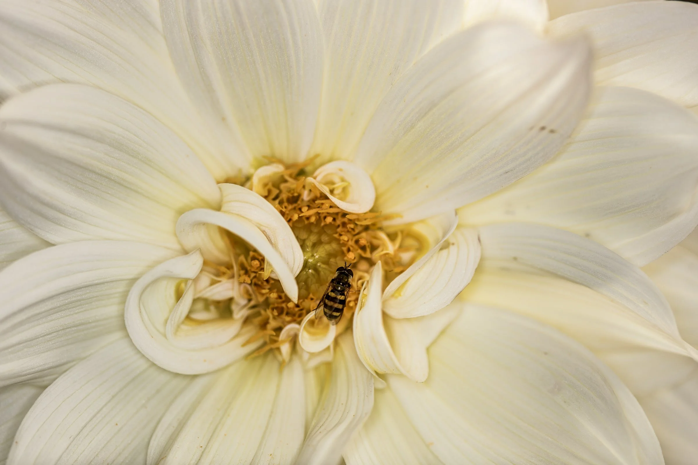 Close-up of a white dahlia flower with a bee on its center.