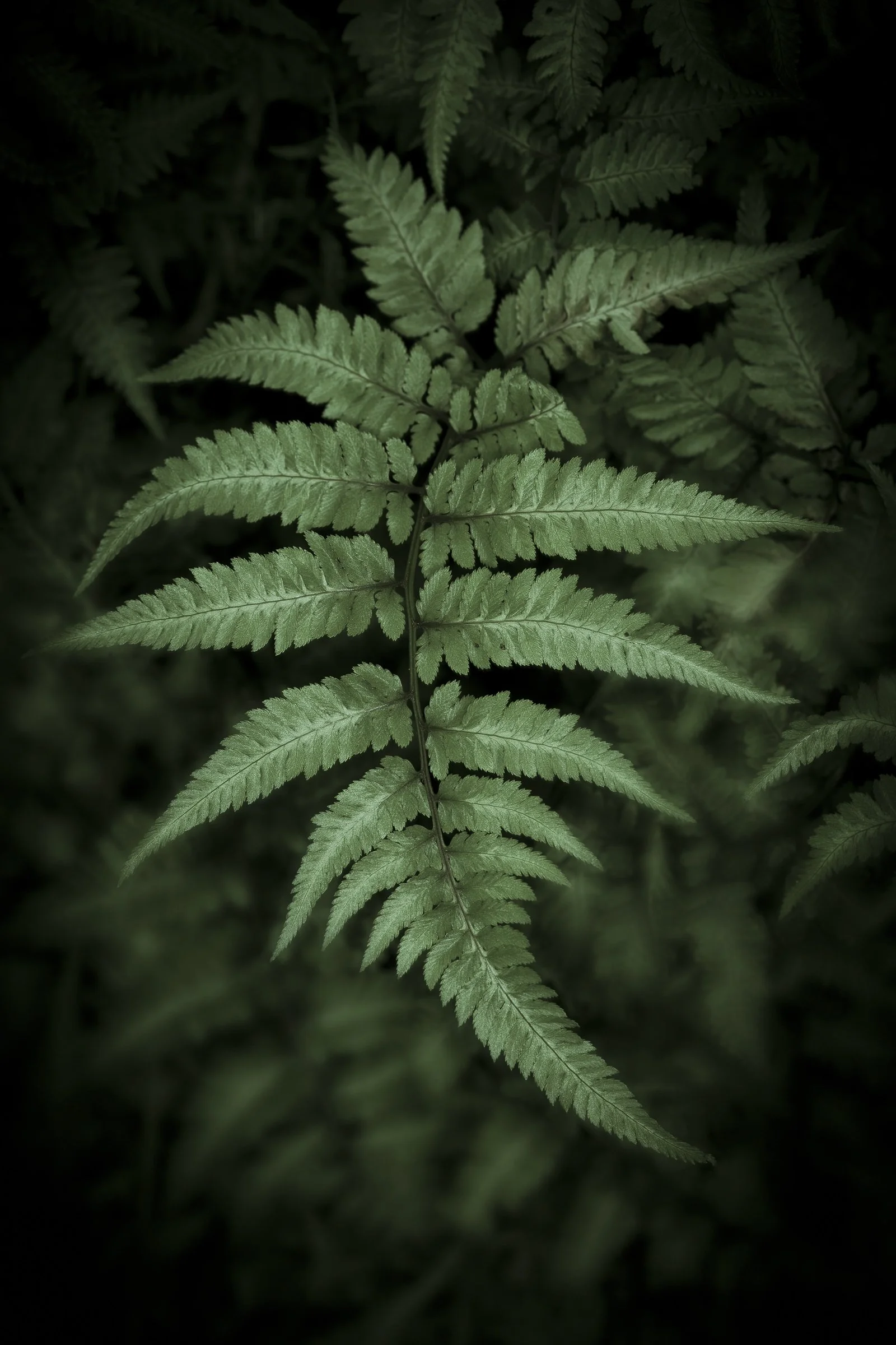 Close-up of green fern leaves with detailed leaflets in a soft, shaded light. View fullsize