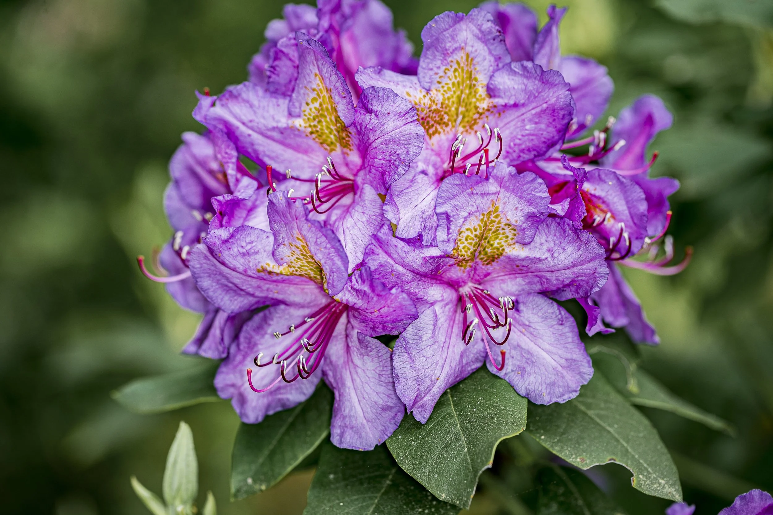 Purple rhododendron flowers with green leaves