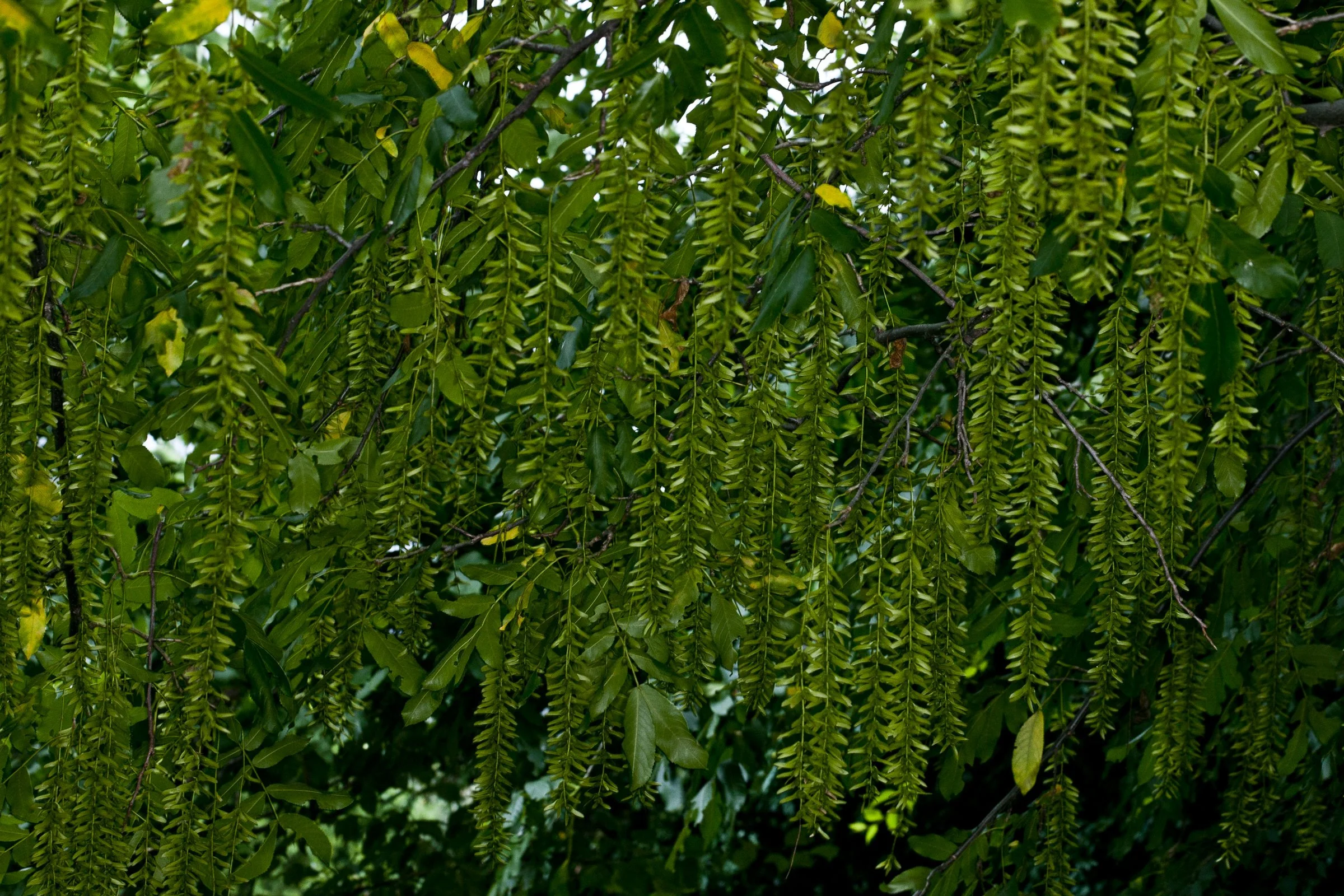 Green hanging catkins and leaves on a tree branch.