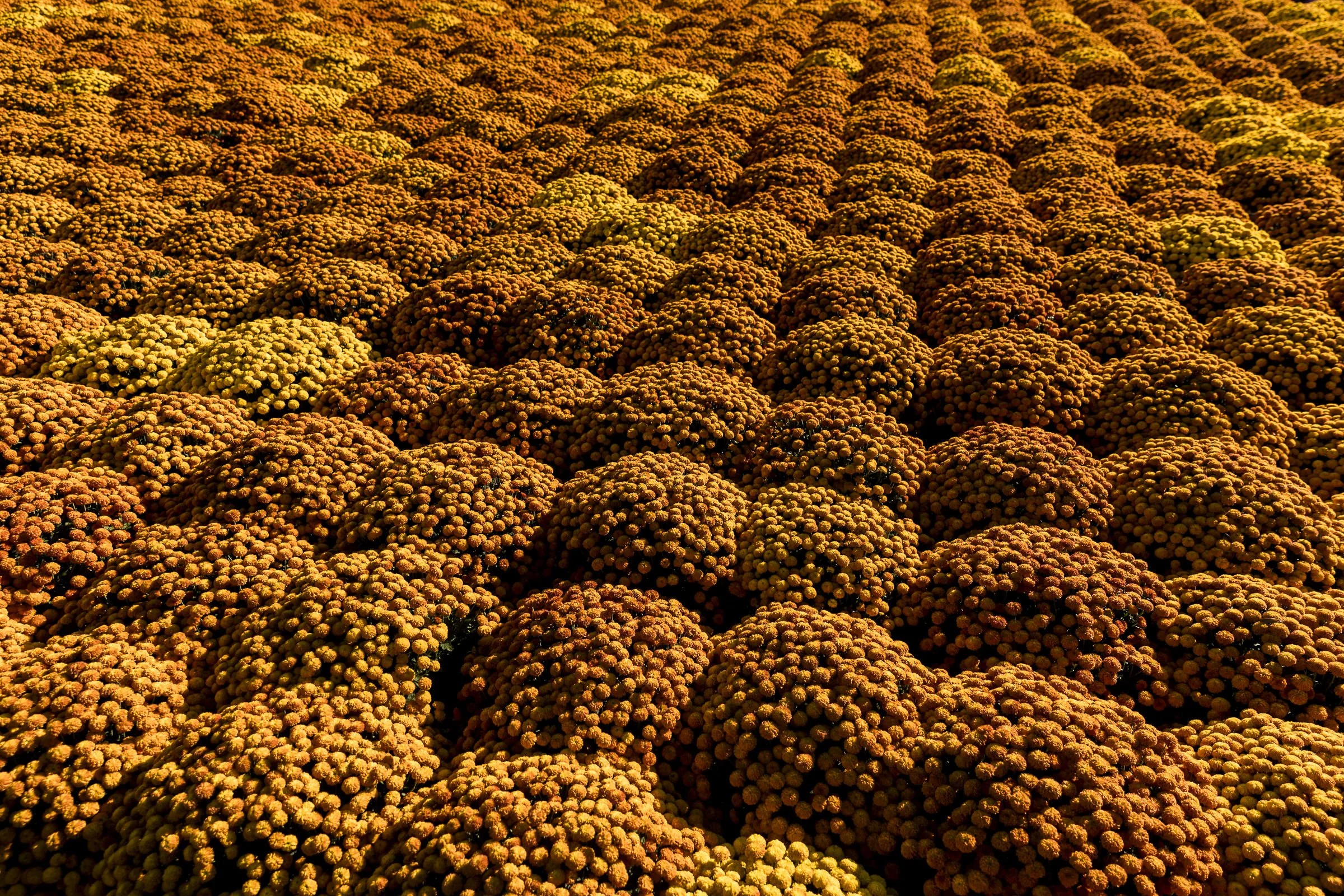 Close-up of multiple piles of small, round, brown nuts or seeds spread across a surface, creating a textured pattern. View fullsize