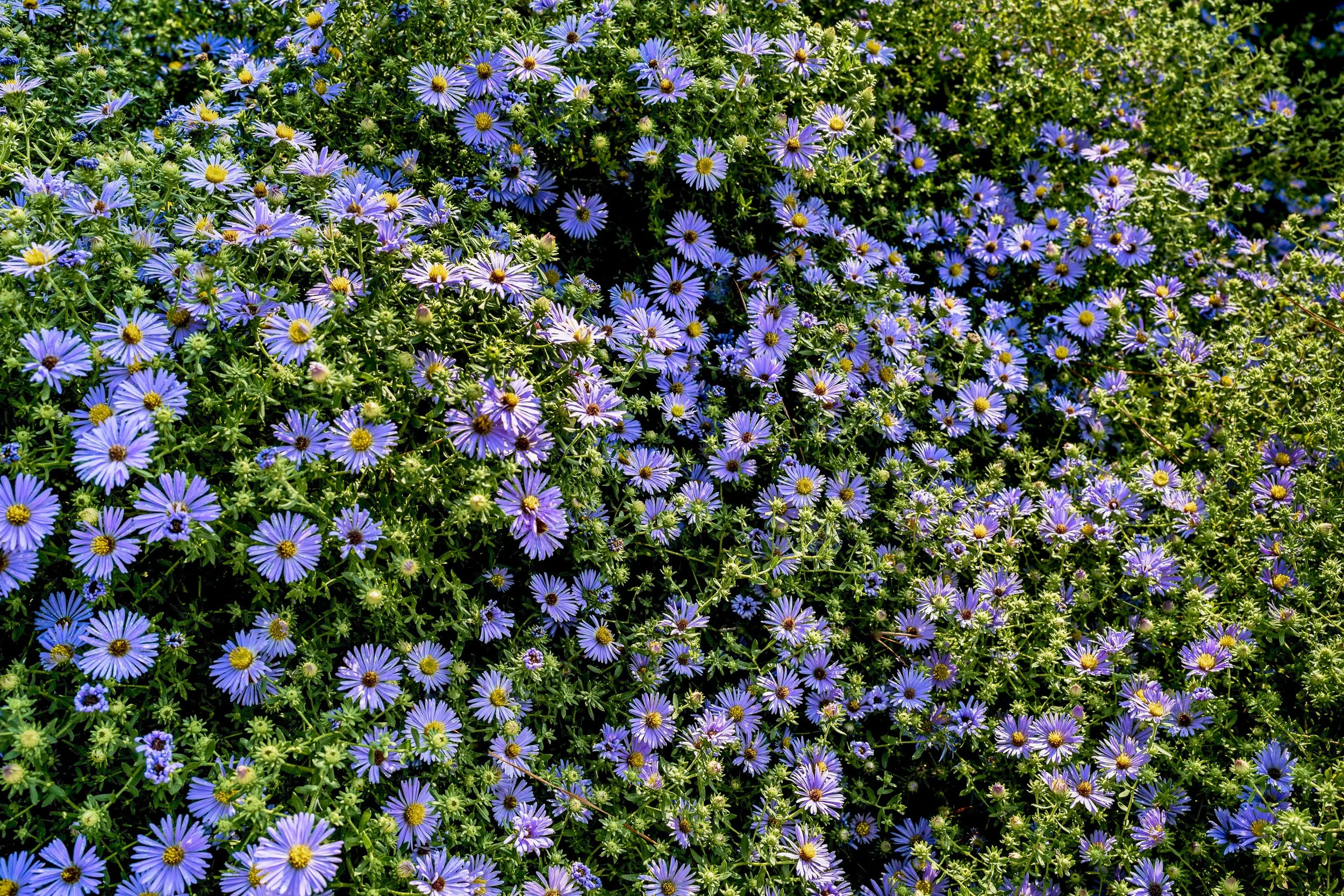 Dense cluster of vibrant purple asters in full bloom with green foliage.