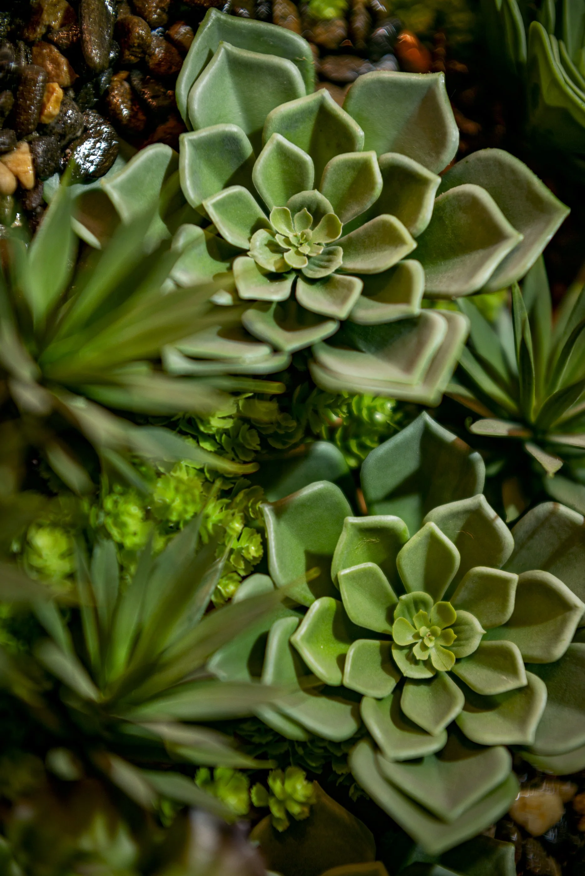 Close-up of green succulents with pointed leaves surrounded by small rocks and other green plants.