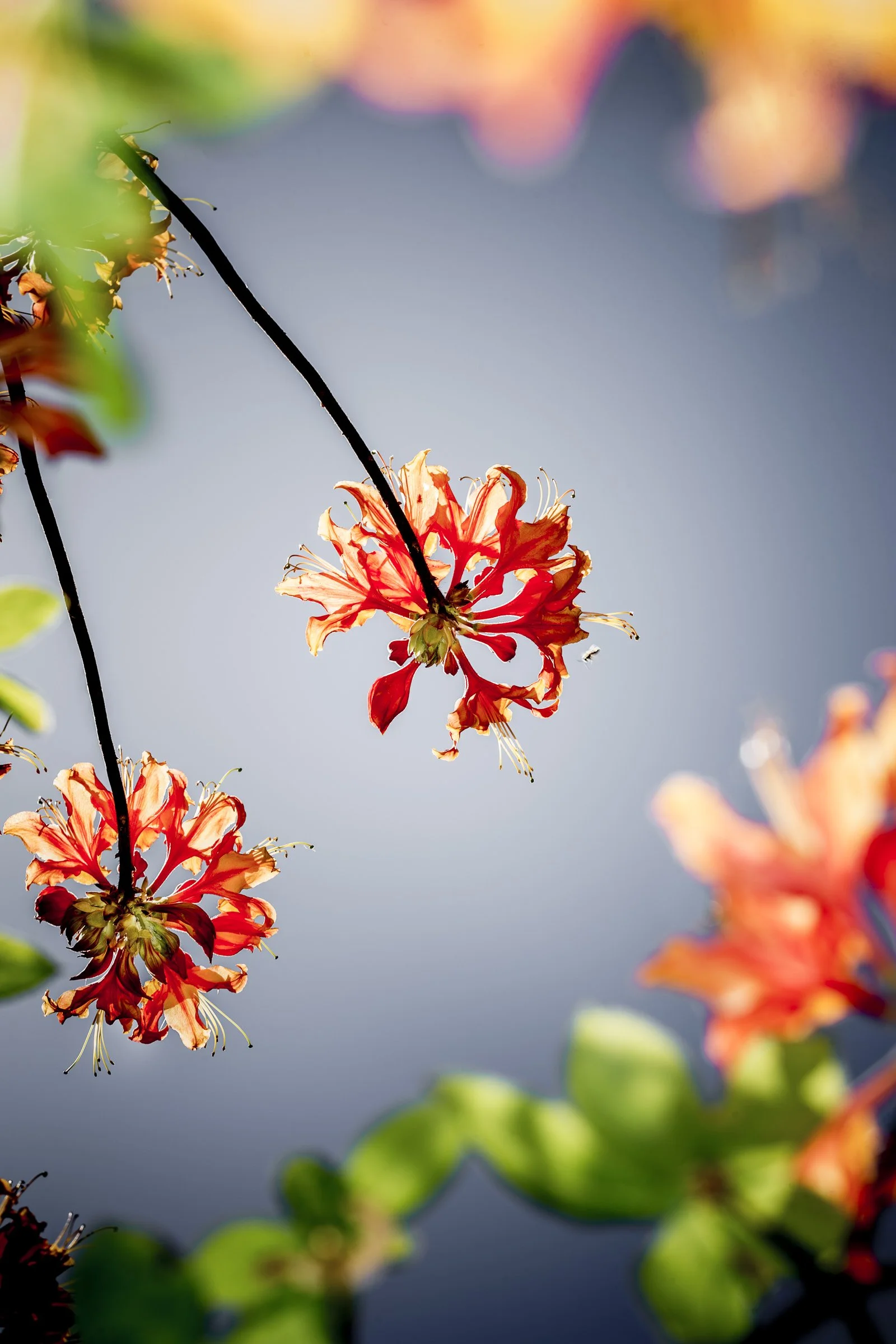 Pink azalea flowers against a clear blue sky. View fullsize