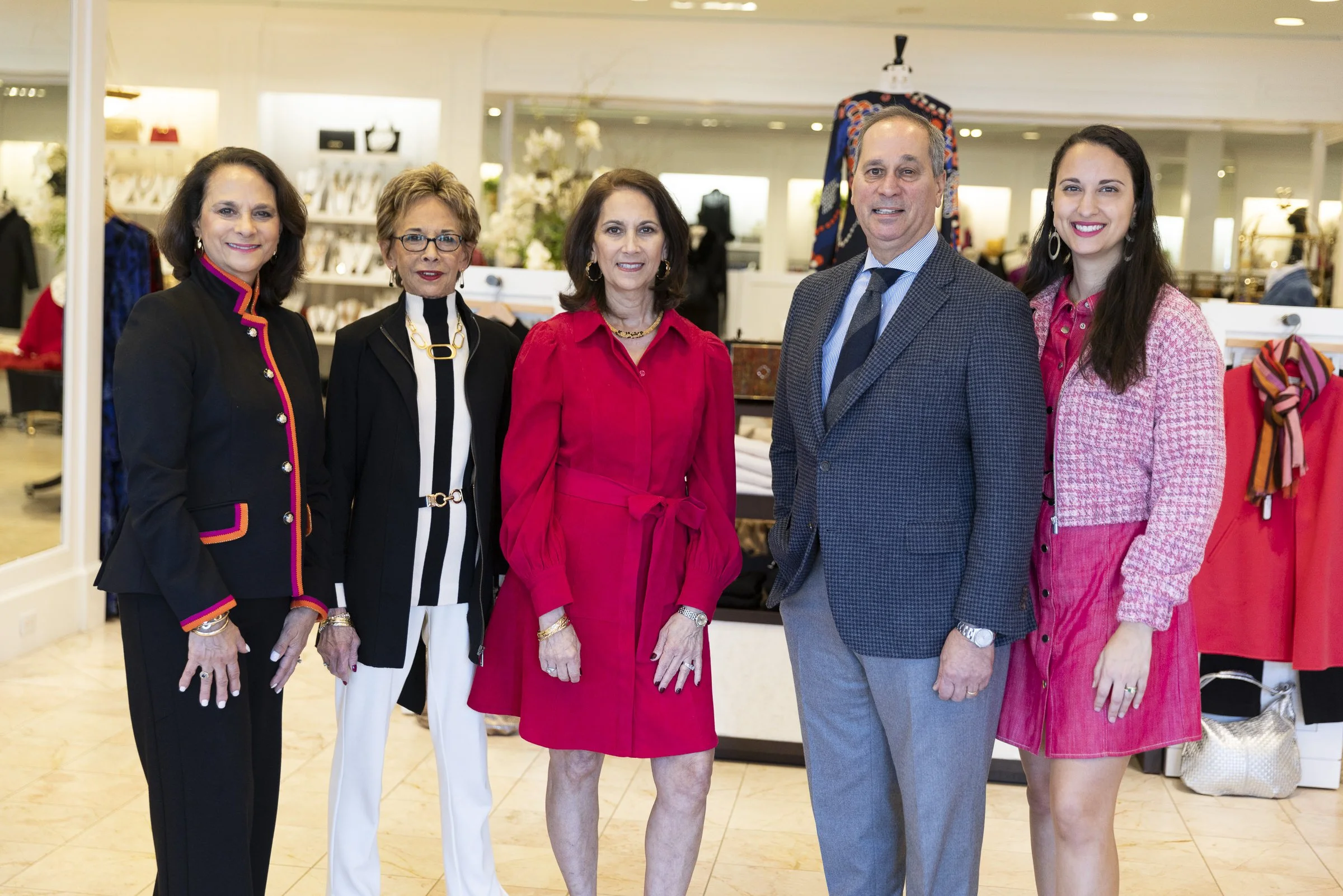 Group of five people standing inside a clothing store, posing for a photo. Three women wear fashionable outfits in black and red, while one man is in a suit, and a younger woman wears pink. The store displays clothing and accessories in the backgroun