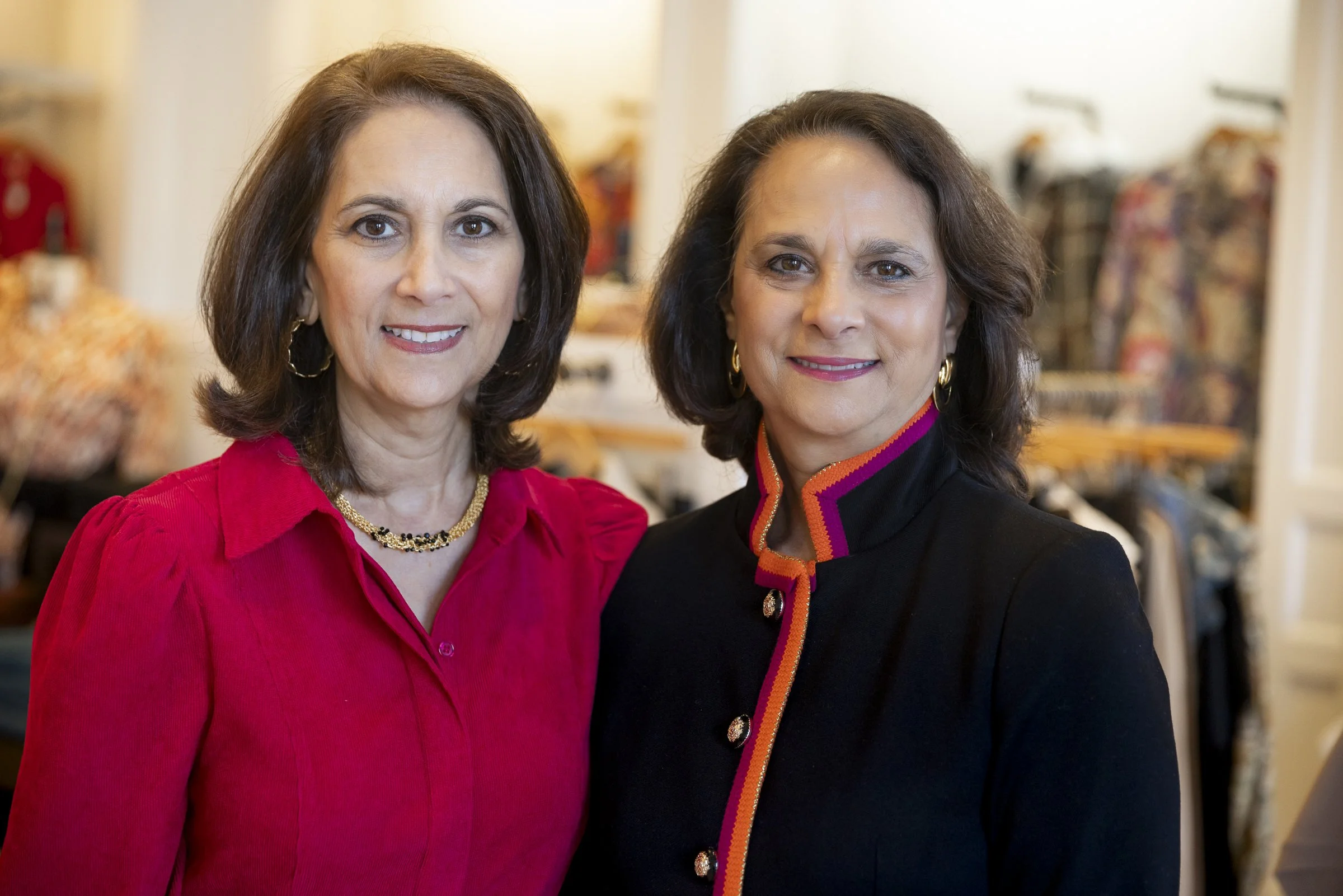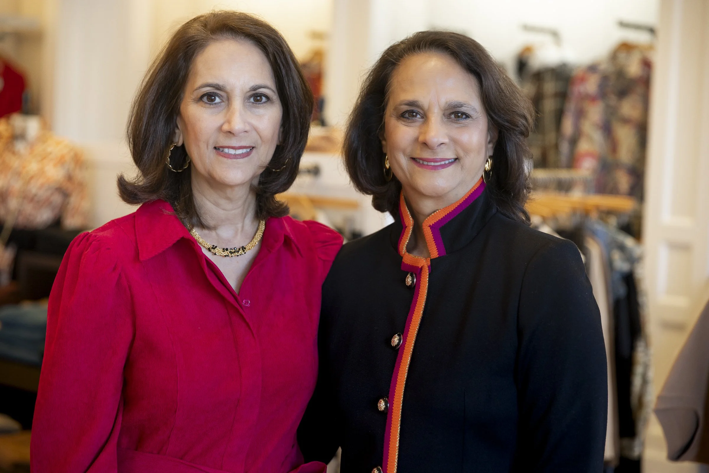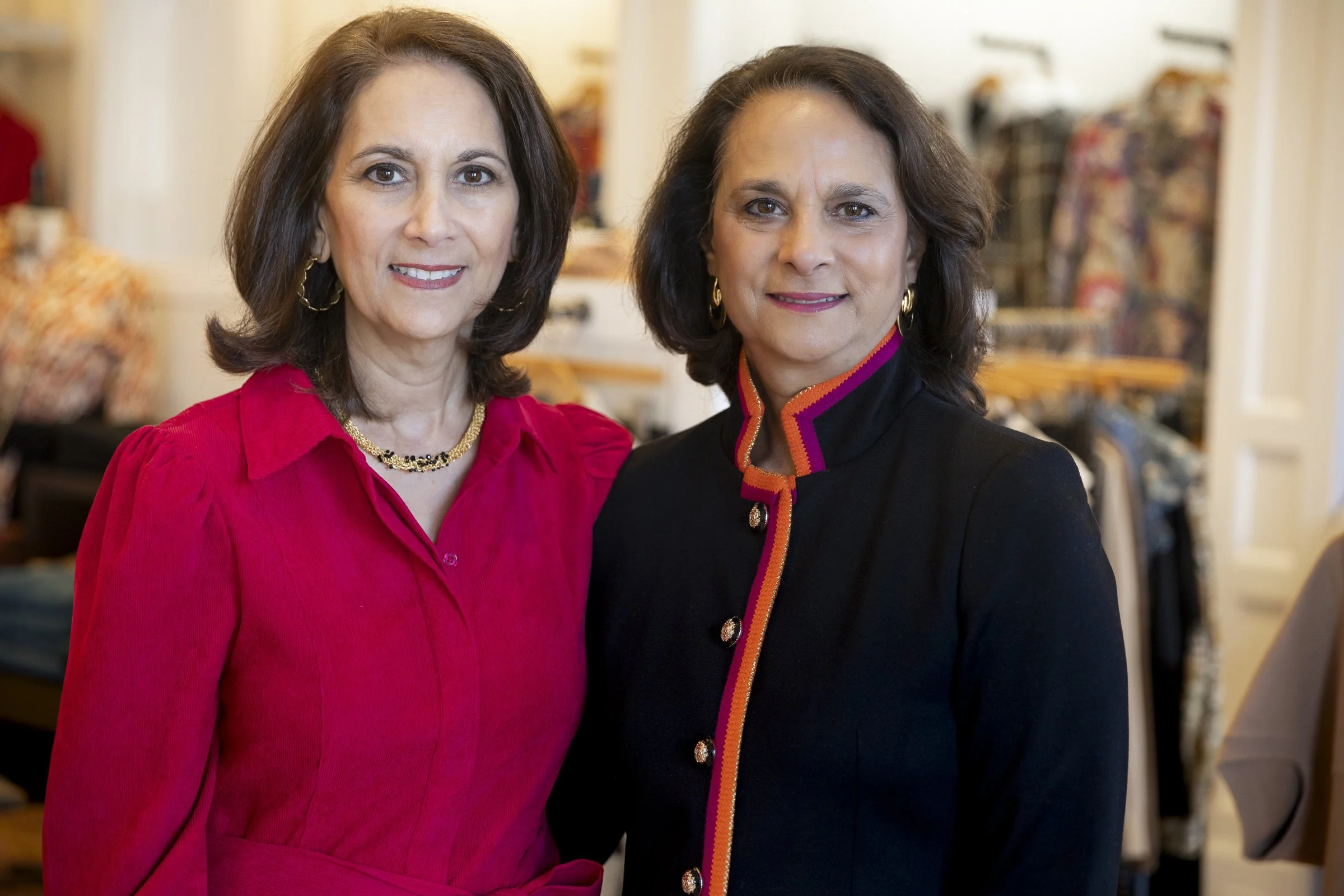 Two women standing in a boutique, one in a red blouse and the other in a black jacket with colorful trim.