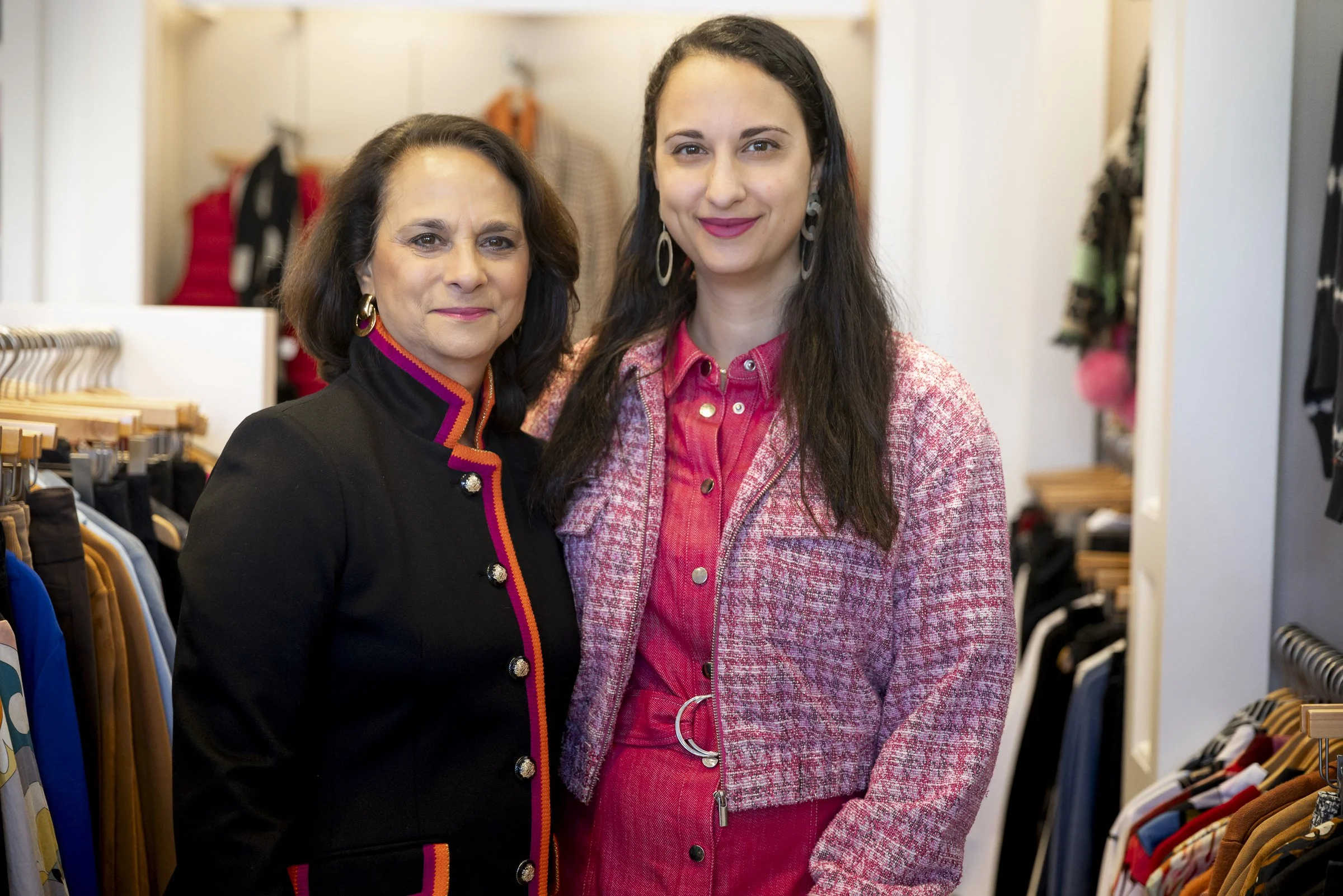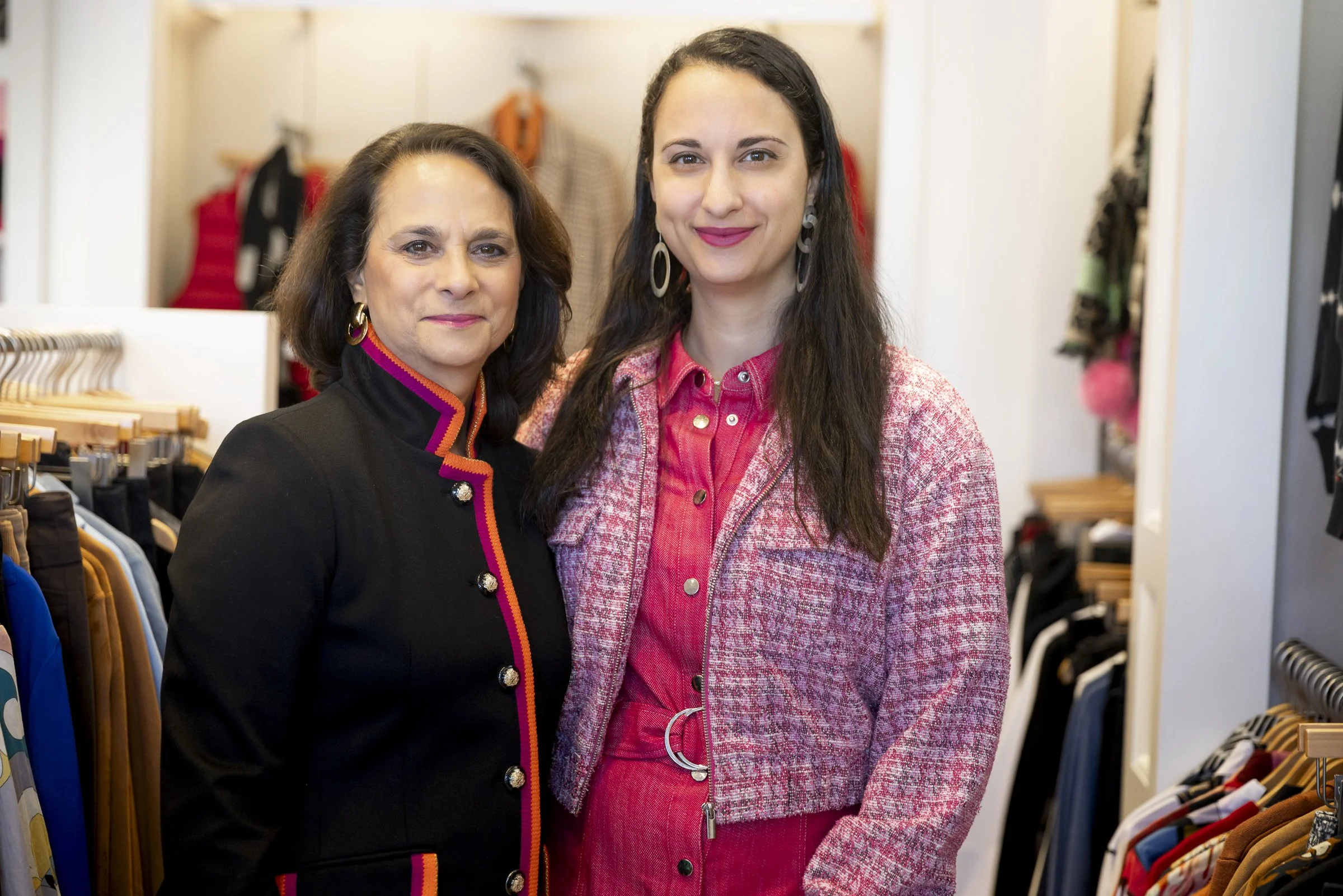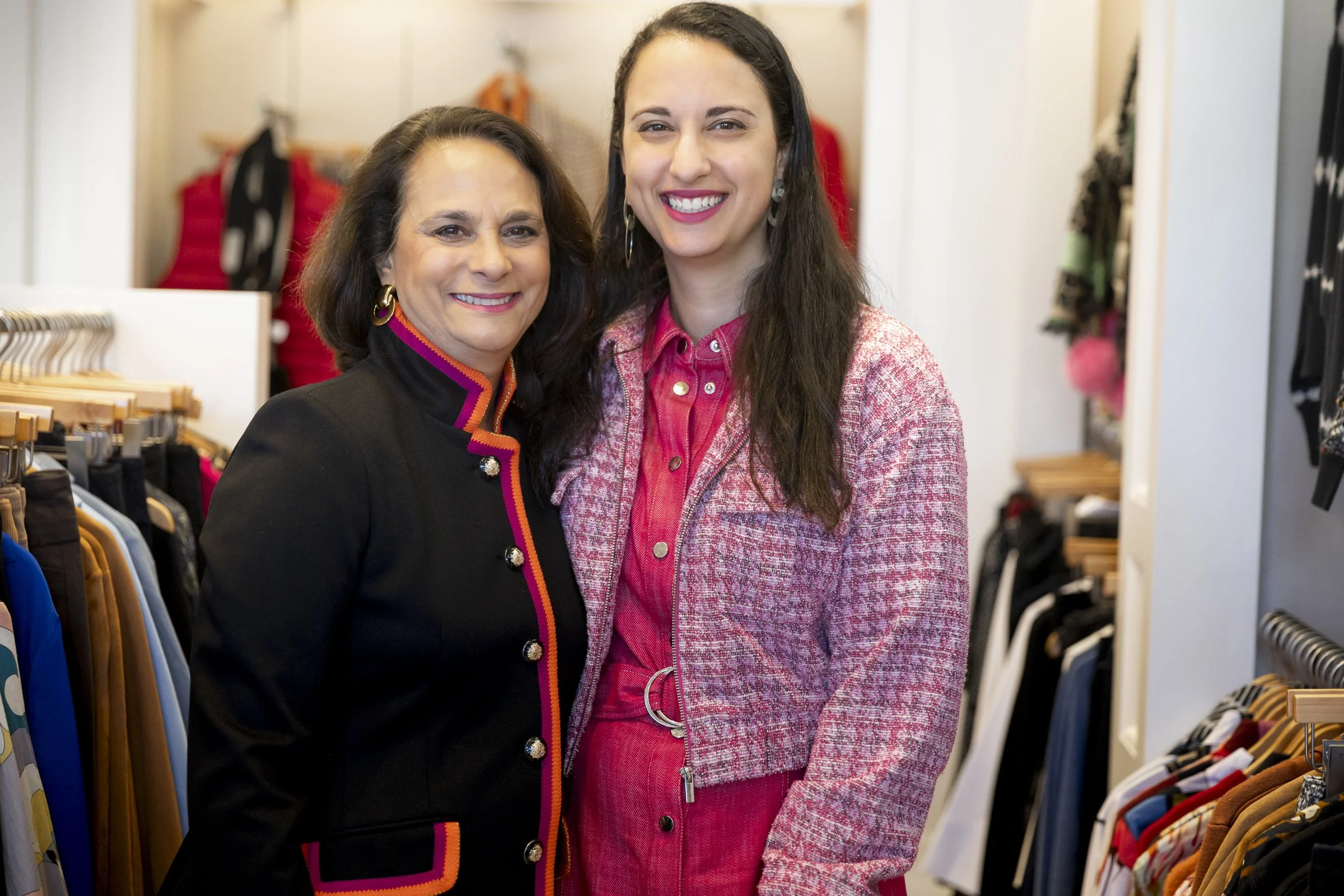 Two women standing in a clothing store, surrounded by racks of clothes. One woman is wearing a black jacket with colorful trim, and the other is in a pink jacket and dress. They are smiling at the camera.
