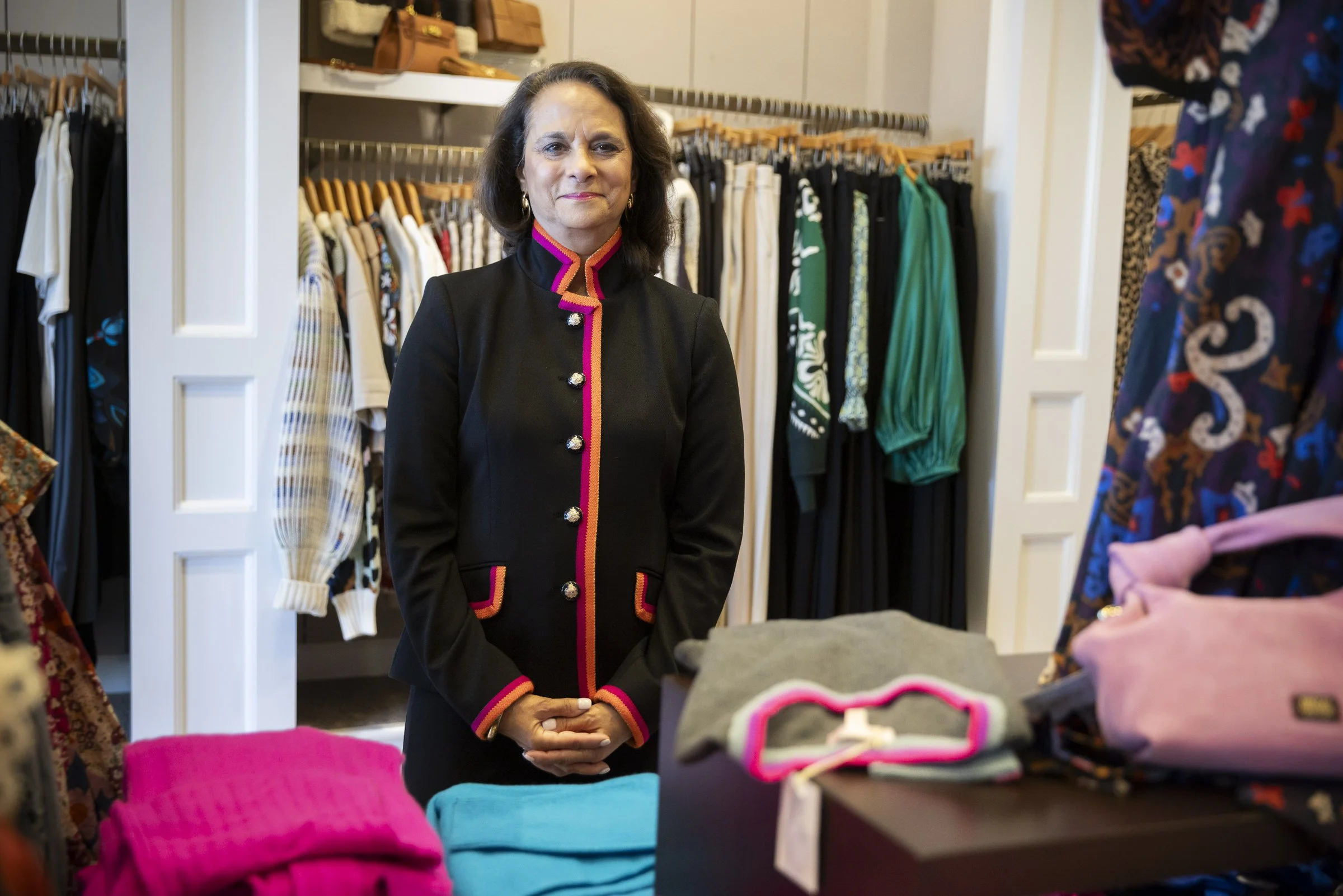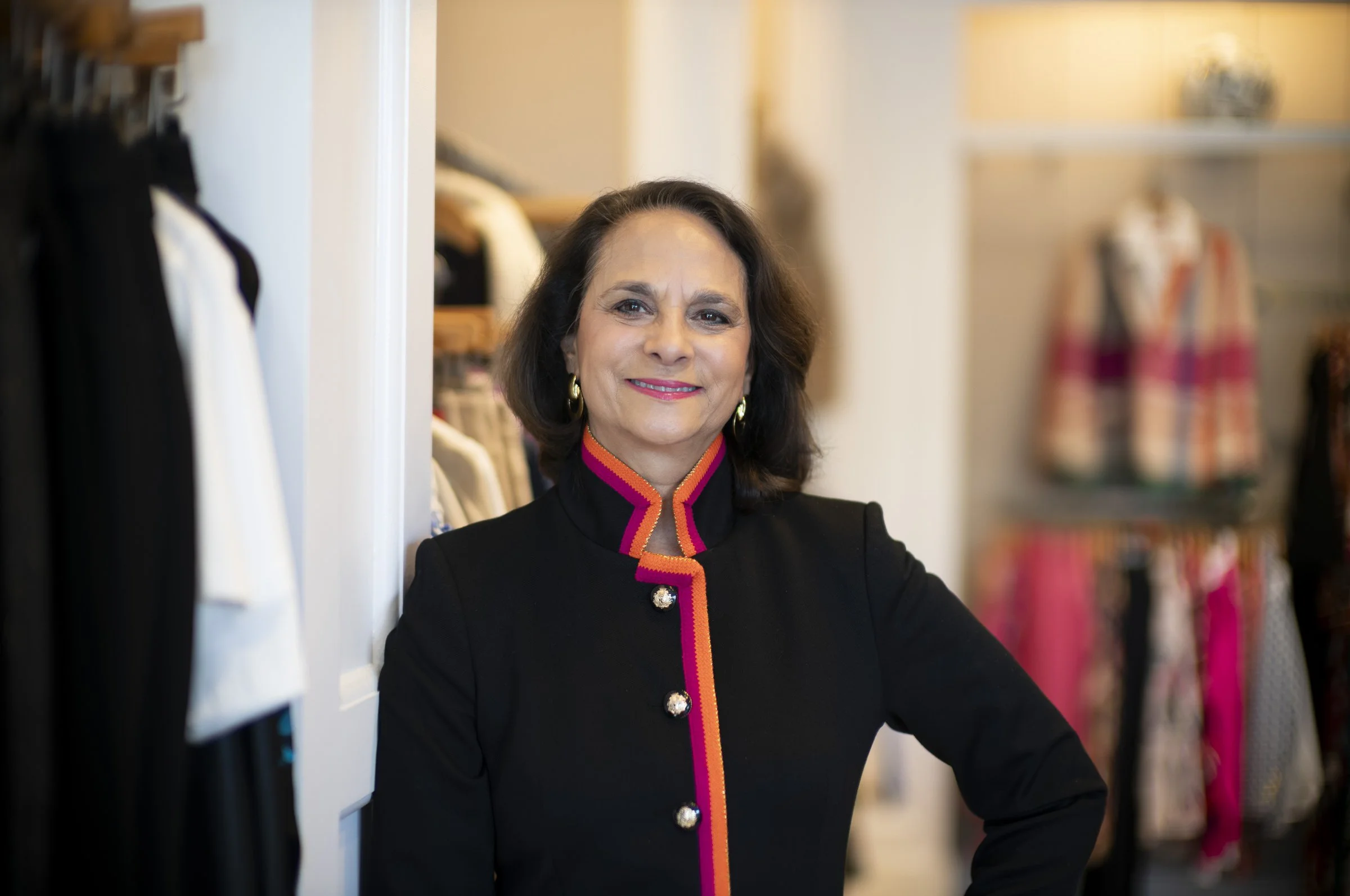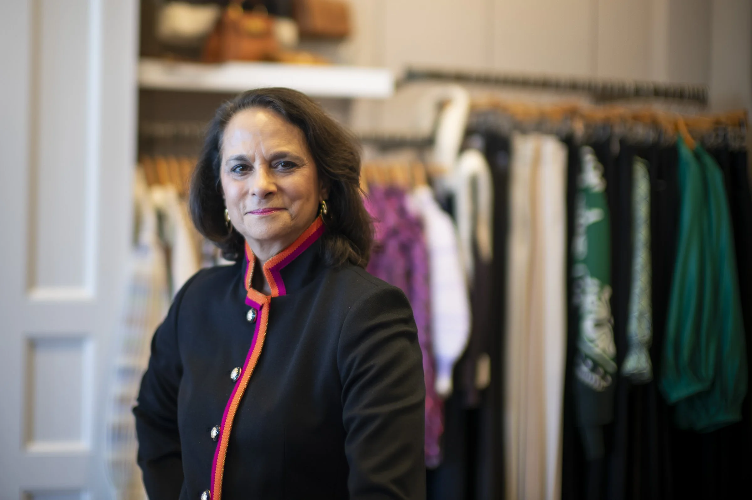 Woman in a black jacket with colored trim standing in a clothing store with racks of clothes in the background.