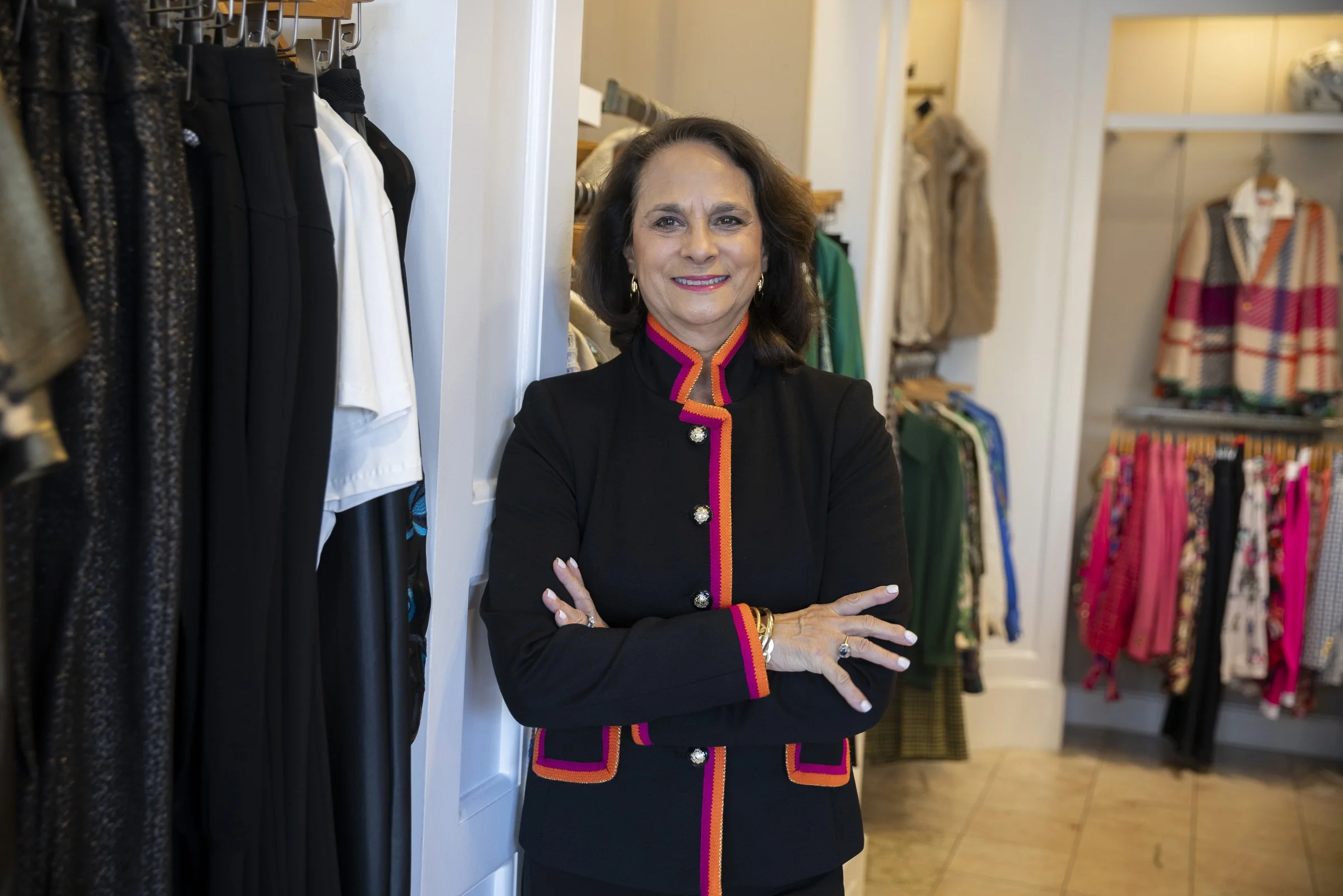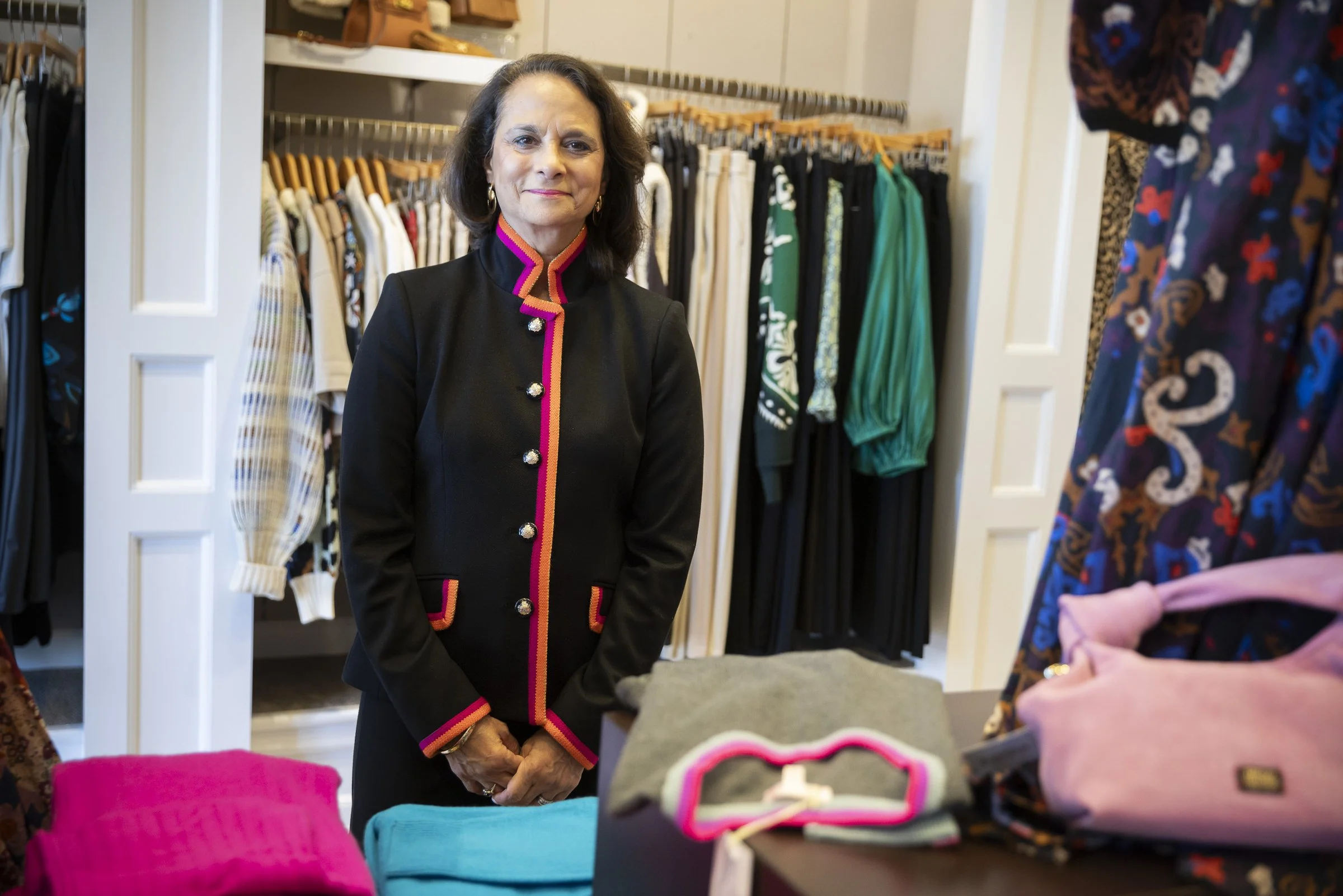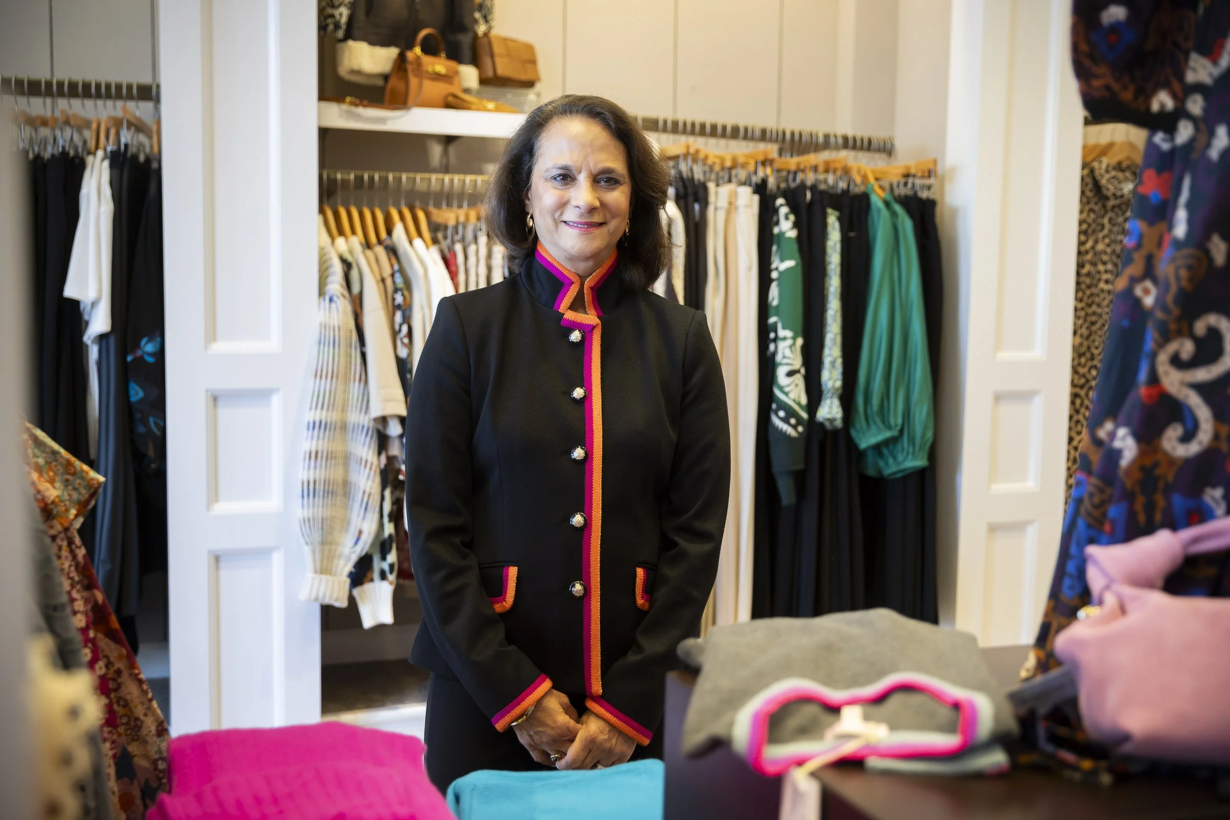 Woman in a black jacket with colored trim standing in a clothing store with racks of clothes in the background.