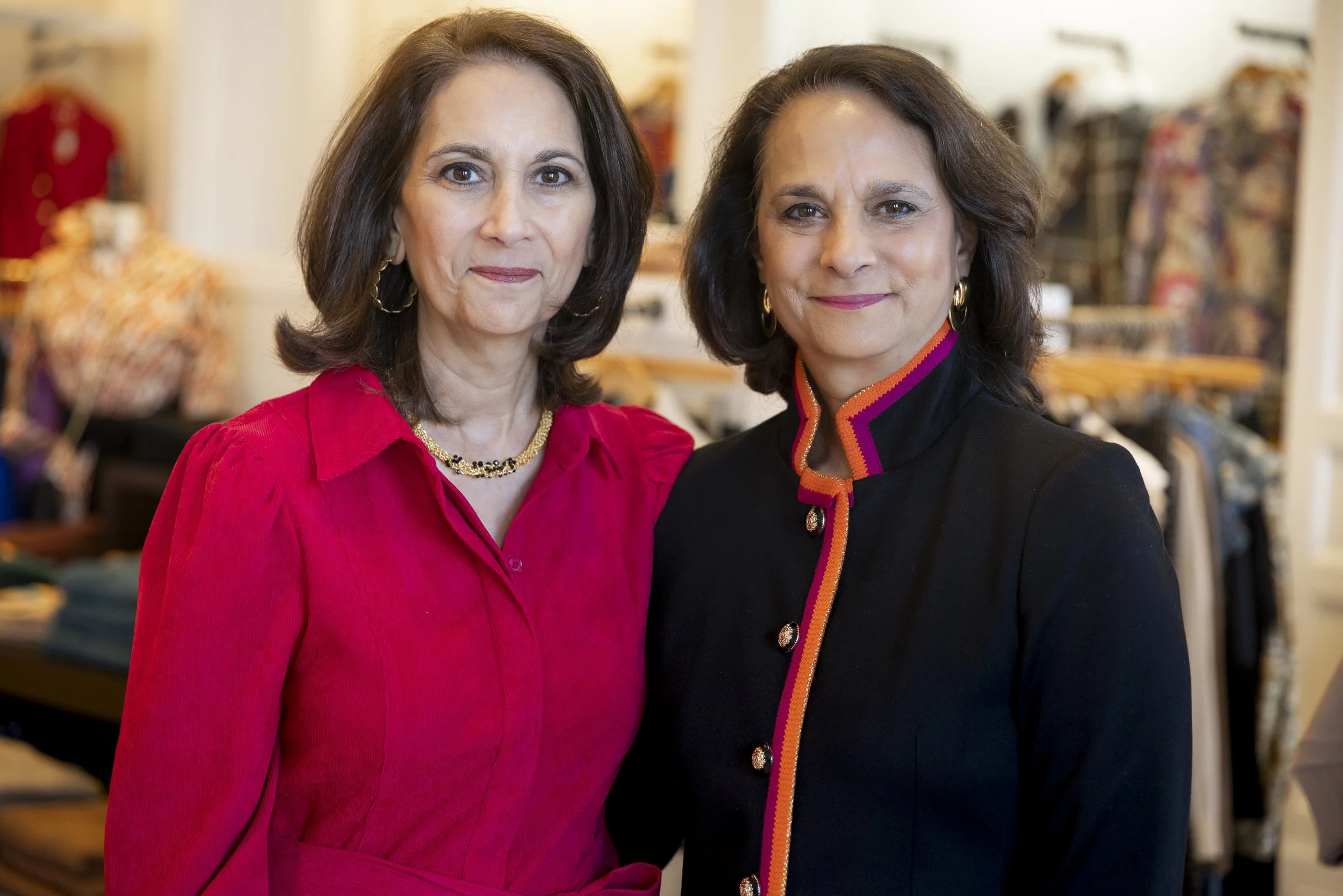 Two women standing in a boutique, one in a red blouse and the other in a black jacket with colorful trim. View fullsize